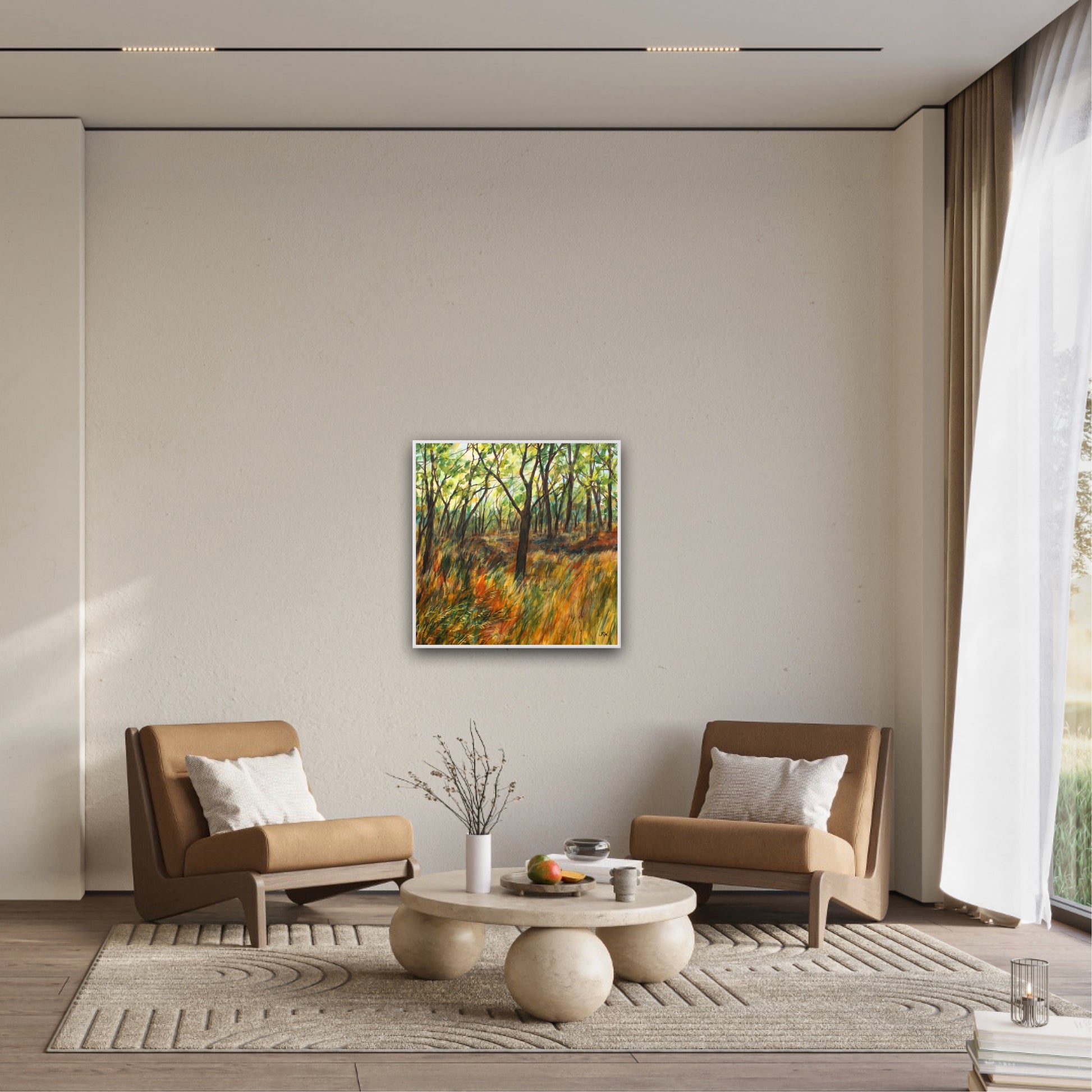 Inspired by the scenic bushland along the drive up to O’Reilly’s Plateau. The dappled sunlight filtering through the trees, earthy tones of grass and undergrowth capturing beauty of the Australian bush.