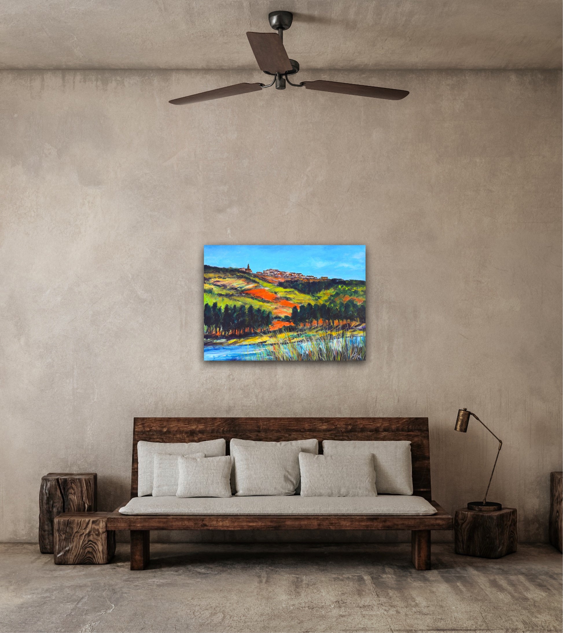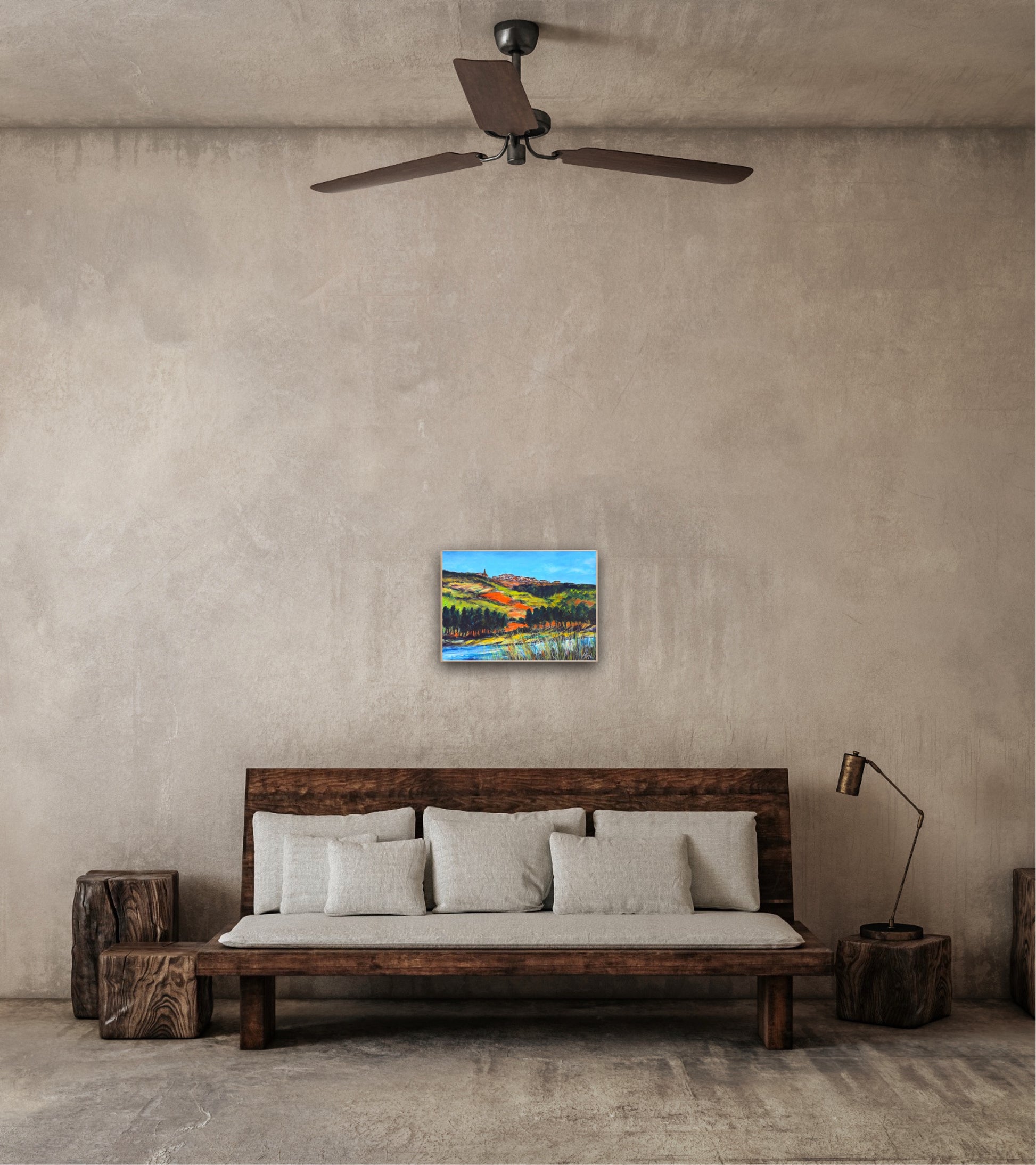 This print is from a painting created during my holiday in France. I sat by the lake enjoying a picnic while sketching Carla-Bayle, the town perched on top of the hill.
