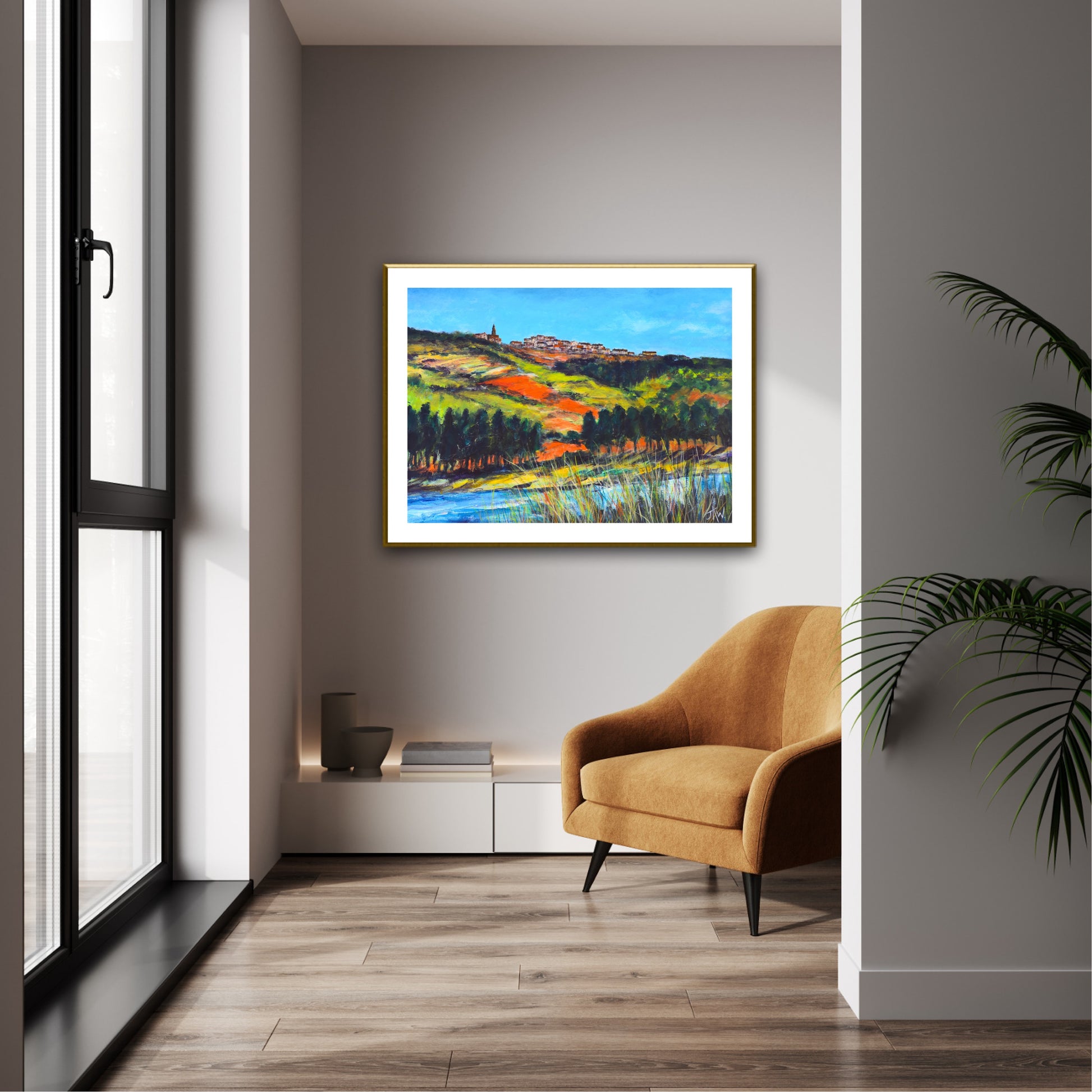 This is a print of a painting I created while on holiday in France. I sat by the lake enjoying a picnic while sketching Carla-Bayle, the town perched atop the hill.