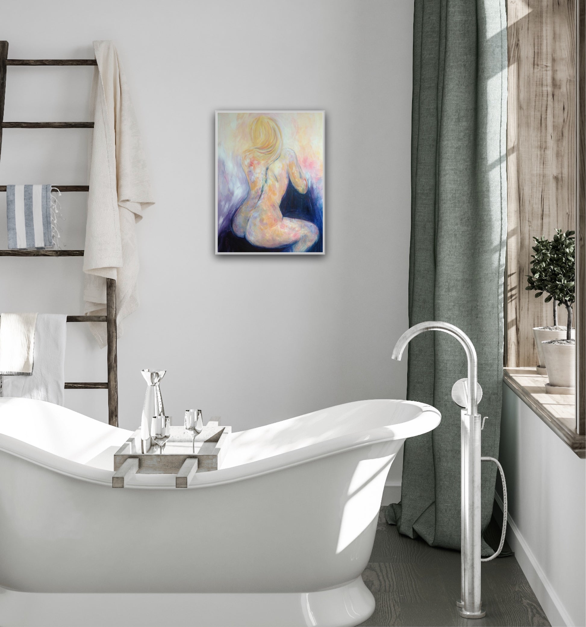 This print depicts a nude seated on a chair, bathed in soft light that reflects gentle pinks, yellows, and violets across her skin.