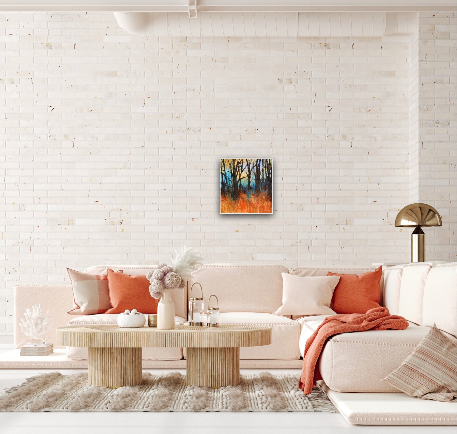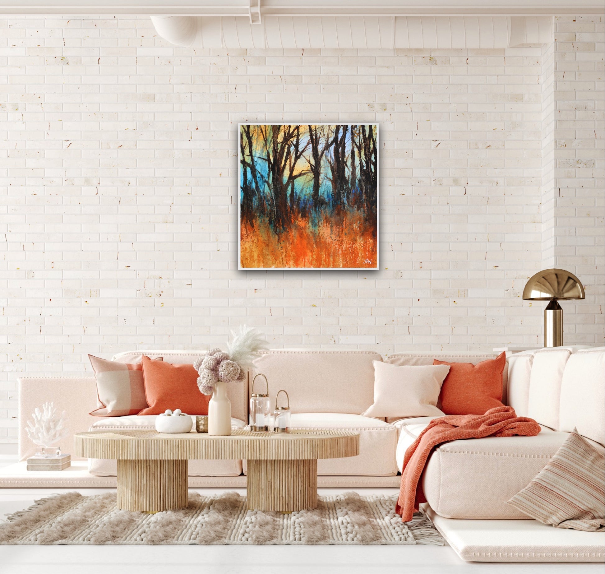 Rich autumn colours of the woodland, burnt orange grasses, dark trees and cool blue air weaving though their branches.