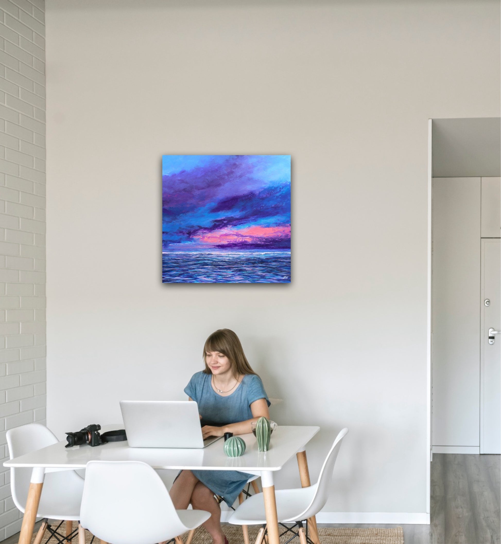 A painting inspired by the quiet ocean under a dramatic sky, the contrast of the moody clouds and soft reflections from the setting sun.