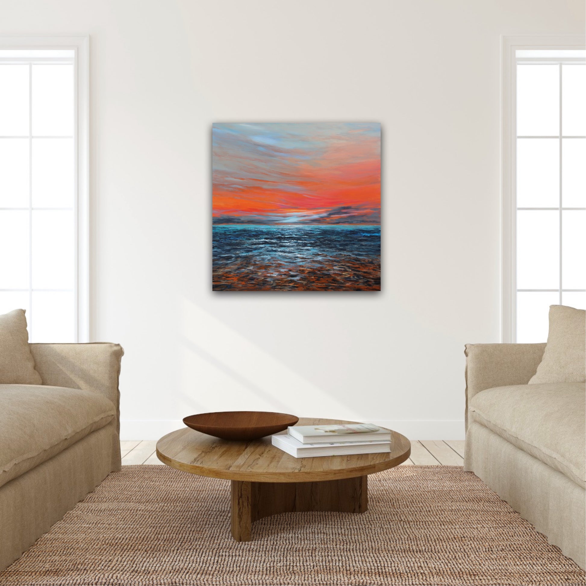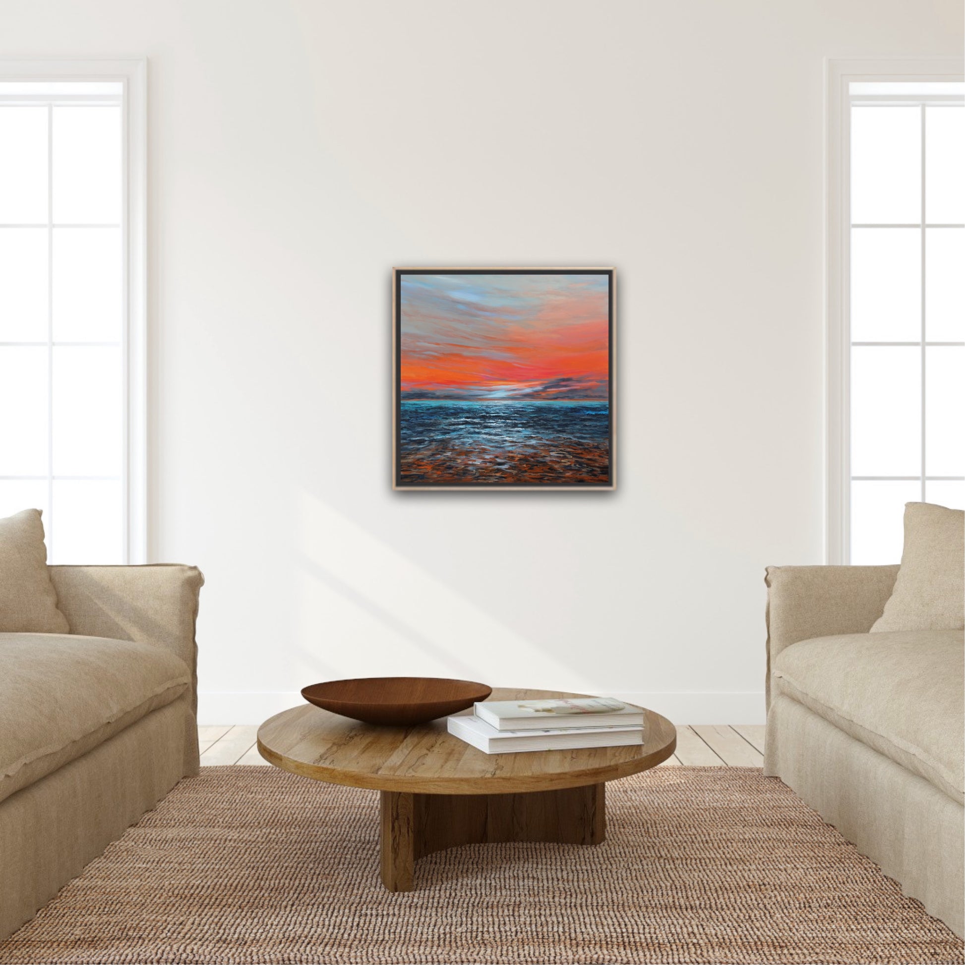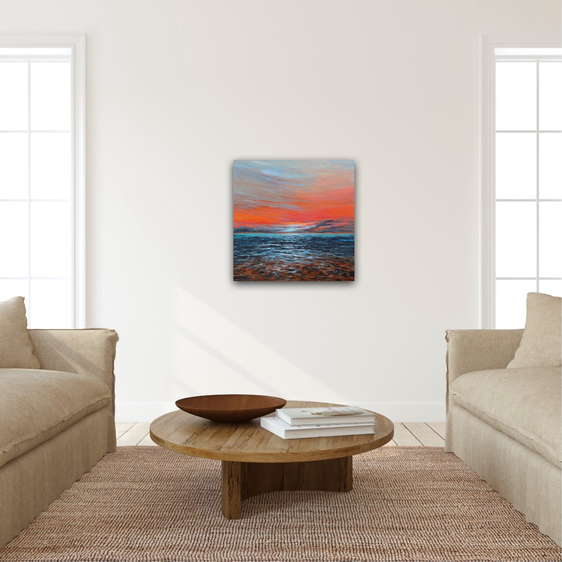 A fiery sky melts into the cool of the sea, the light shimmering over the sea reflecting on the sand as night falls.