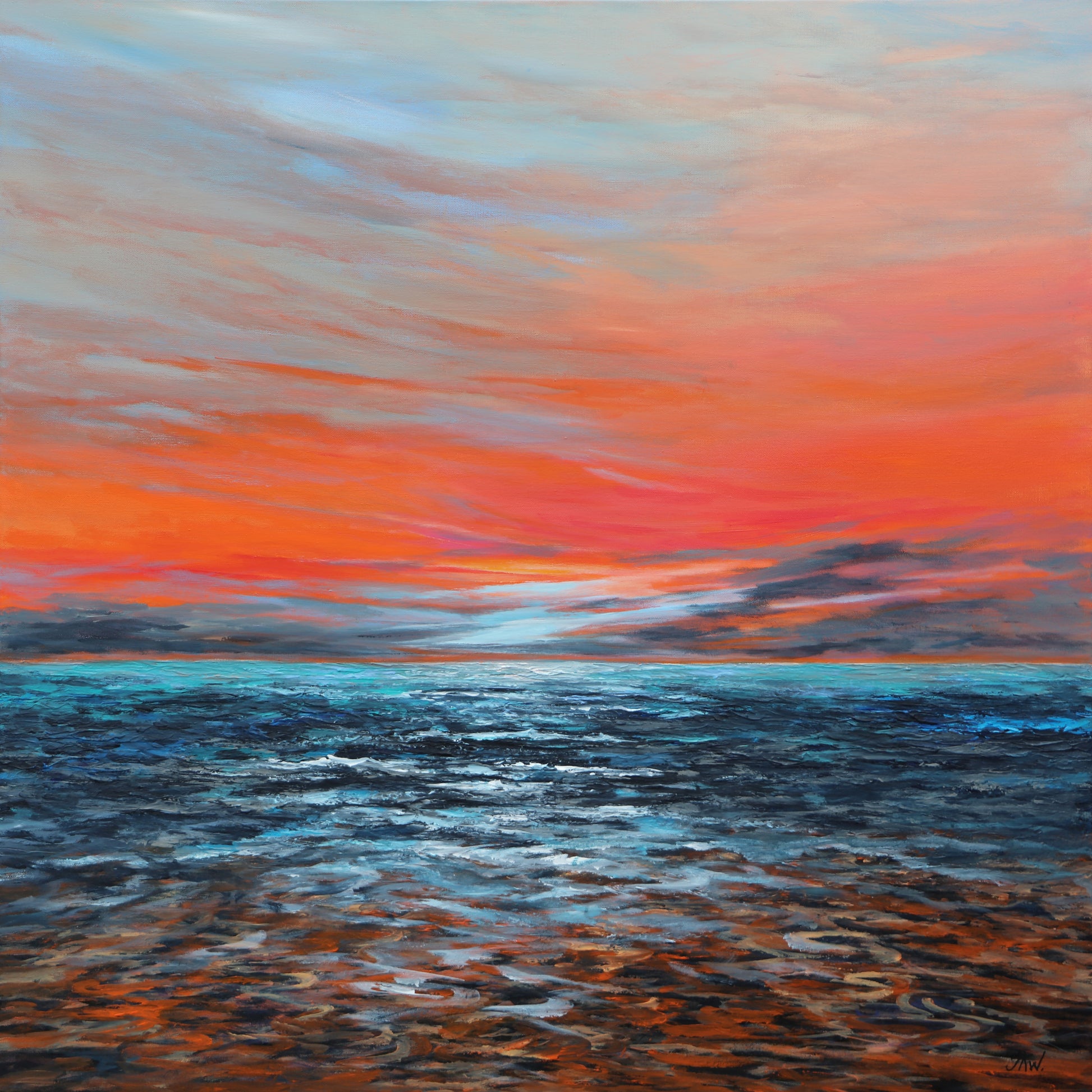A fiery sky melts into the cool of the sea, with light shimmering over the water and reflecting on the sand as night falls.