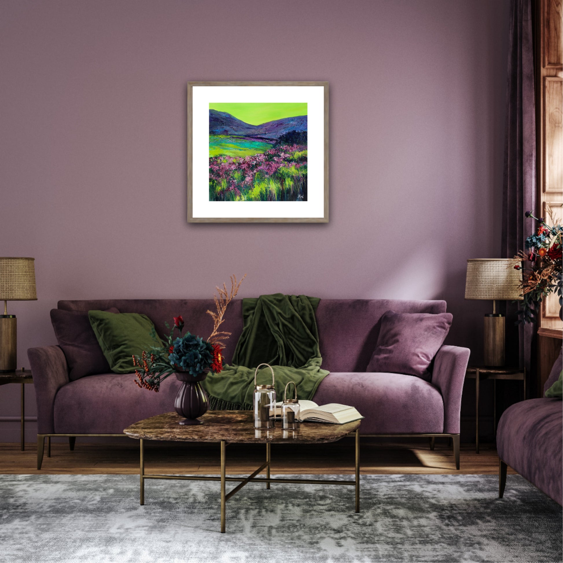This textured acrylic painting is a contemporary piece, the colours aren’t totally natural, they clash and glow together. The hills just shapes and the wild heather just texture and vibrance.
