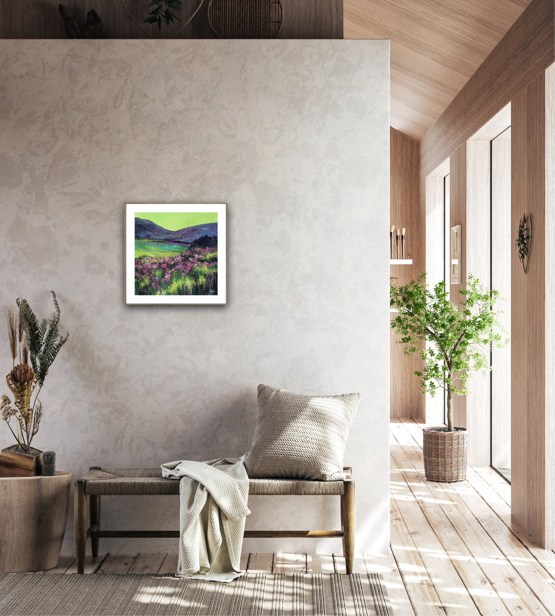 This textured acrylic painting is a contemporary interpretation of the landscape. The colours are intentionally unconventional—clashing, glowing and working together in a vibrant harmony. The hills are suggested through simple shapes, while the wild heather is expressed through texture and rich colour.