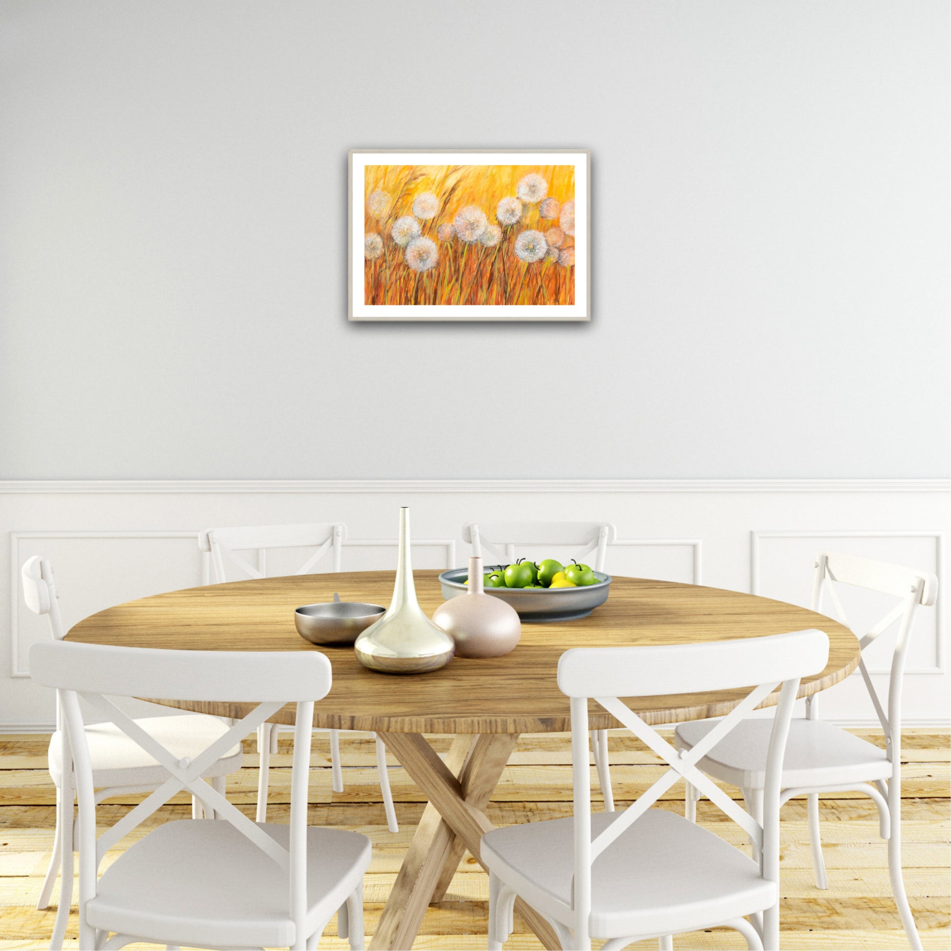 A print of a painting inspired by walking through the local farmland on a Sunday afternoon, with warm sun reflecting off the golden grasses and dandelions gently swaying in the breeze.