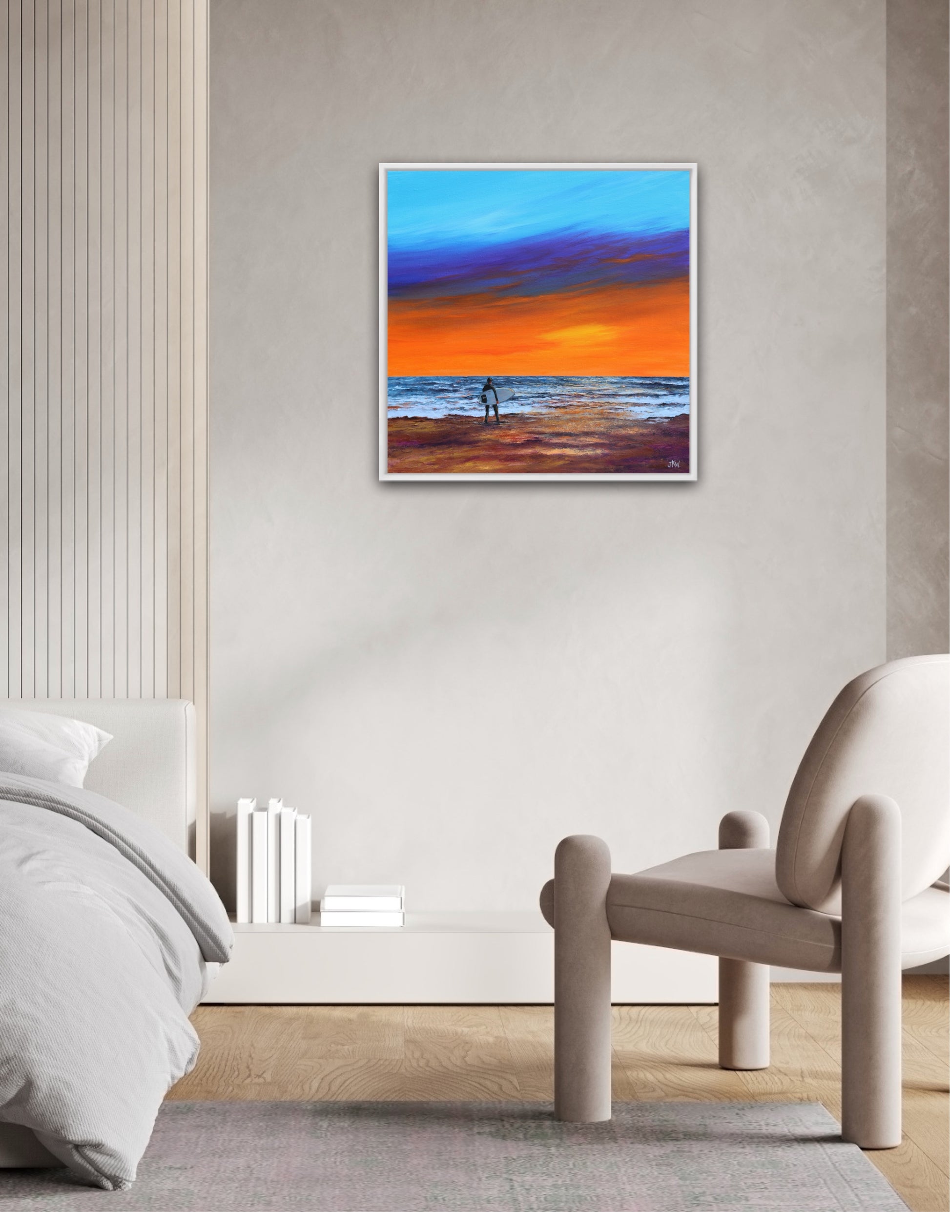 A solitary surfer stands at the water’s edge gazing out at the vast ocean, watching the setting sun and settling waves as the day comes to a close.