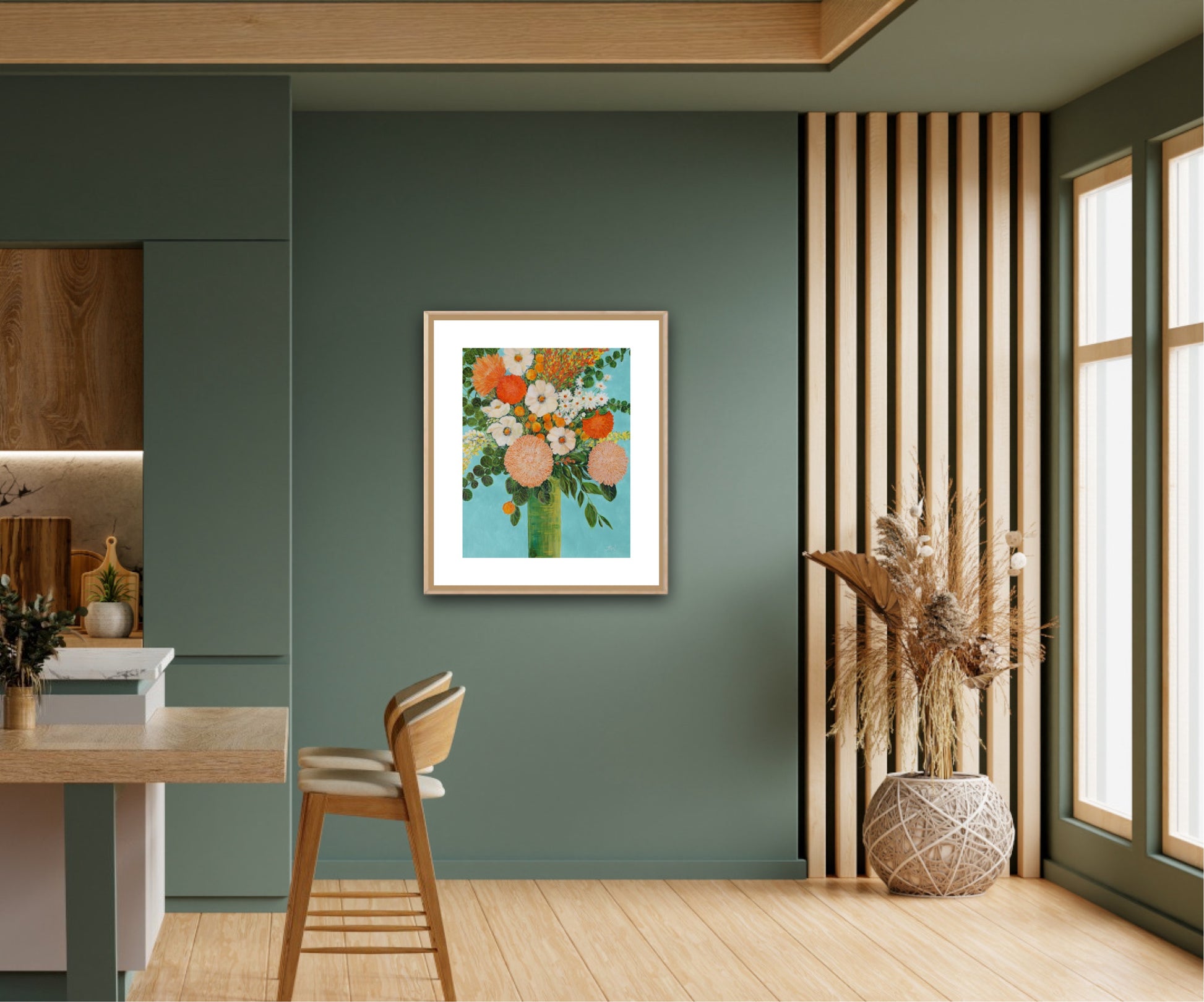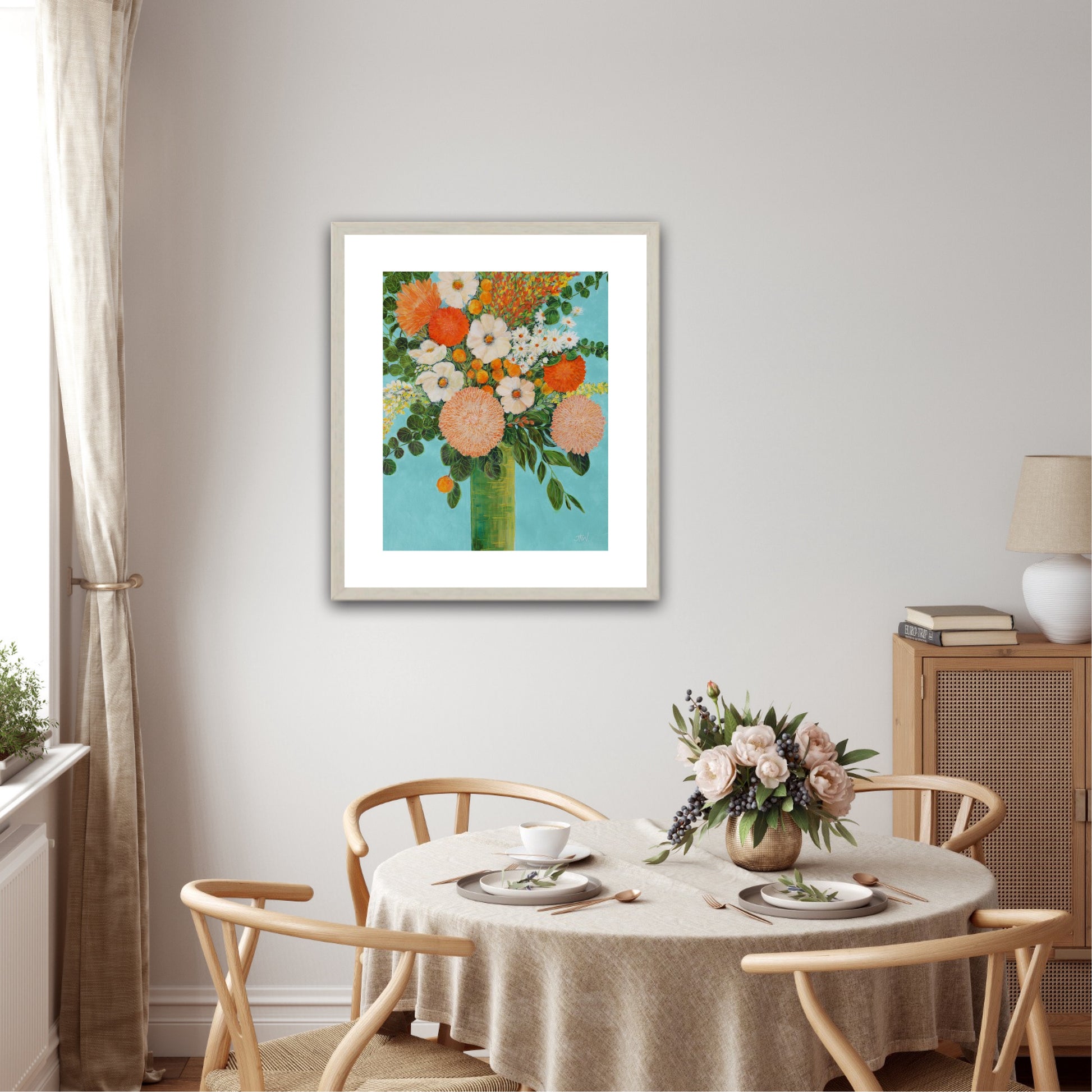 This contemporary vibrant acrylic painting captures the energy of a lush flower arrangement in shades of orange and cream.