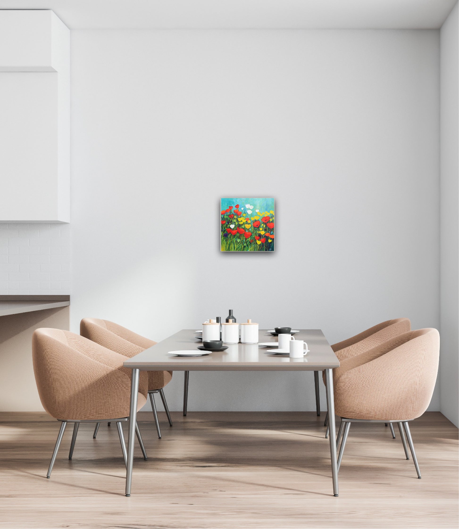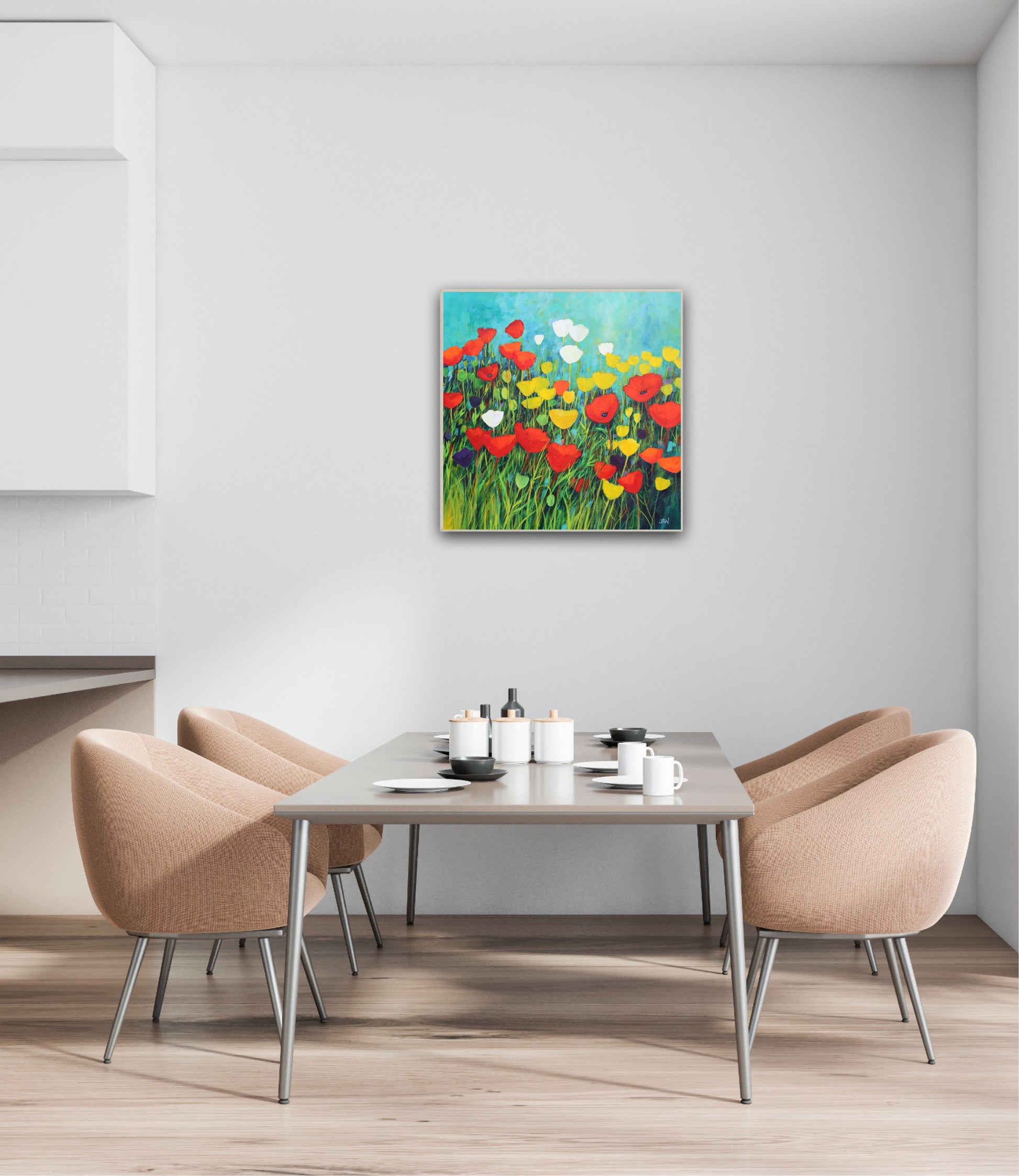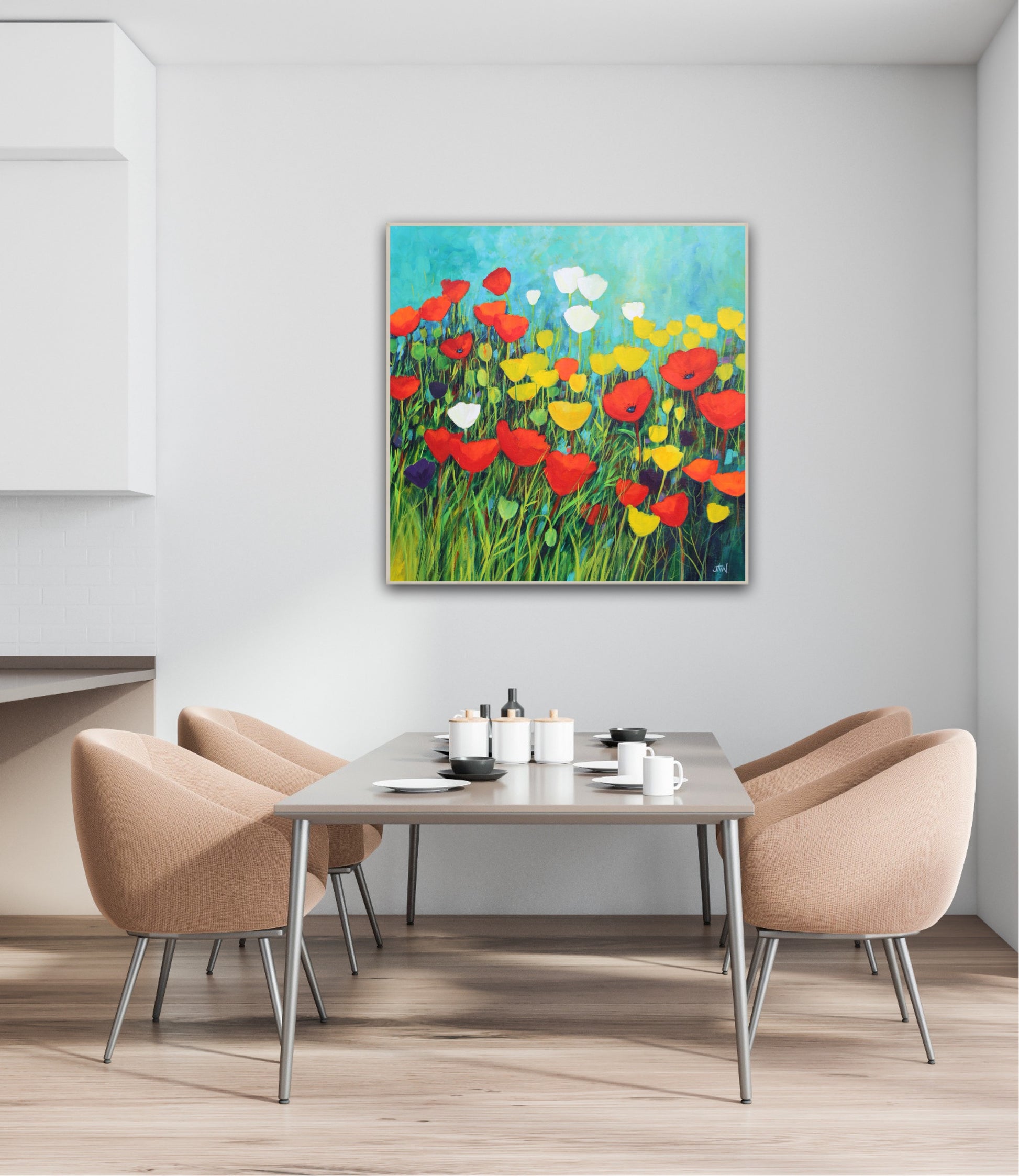 A painting inspired by the bold colours of poppies and tulips rising naturally in a meadow, arranged in an unplanned, organic way.