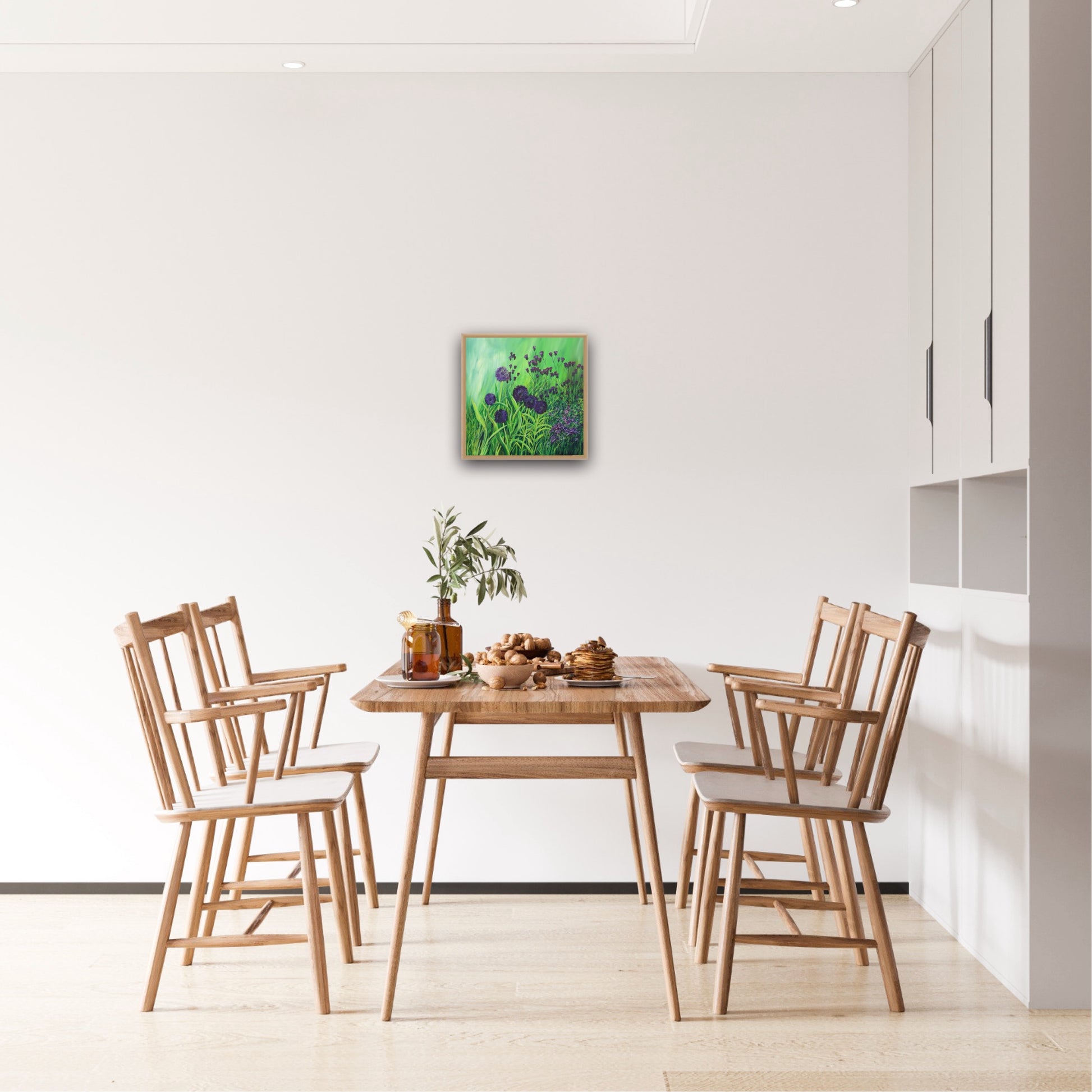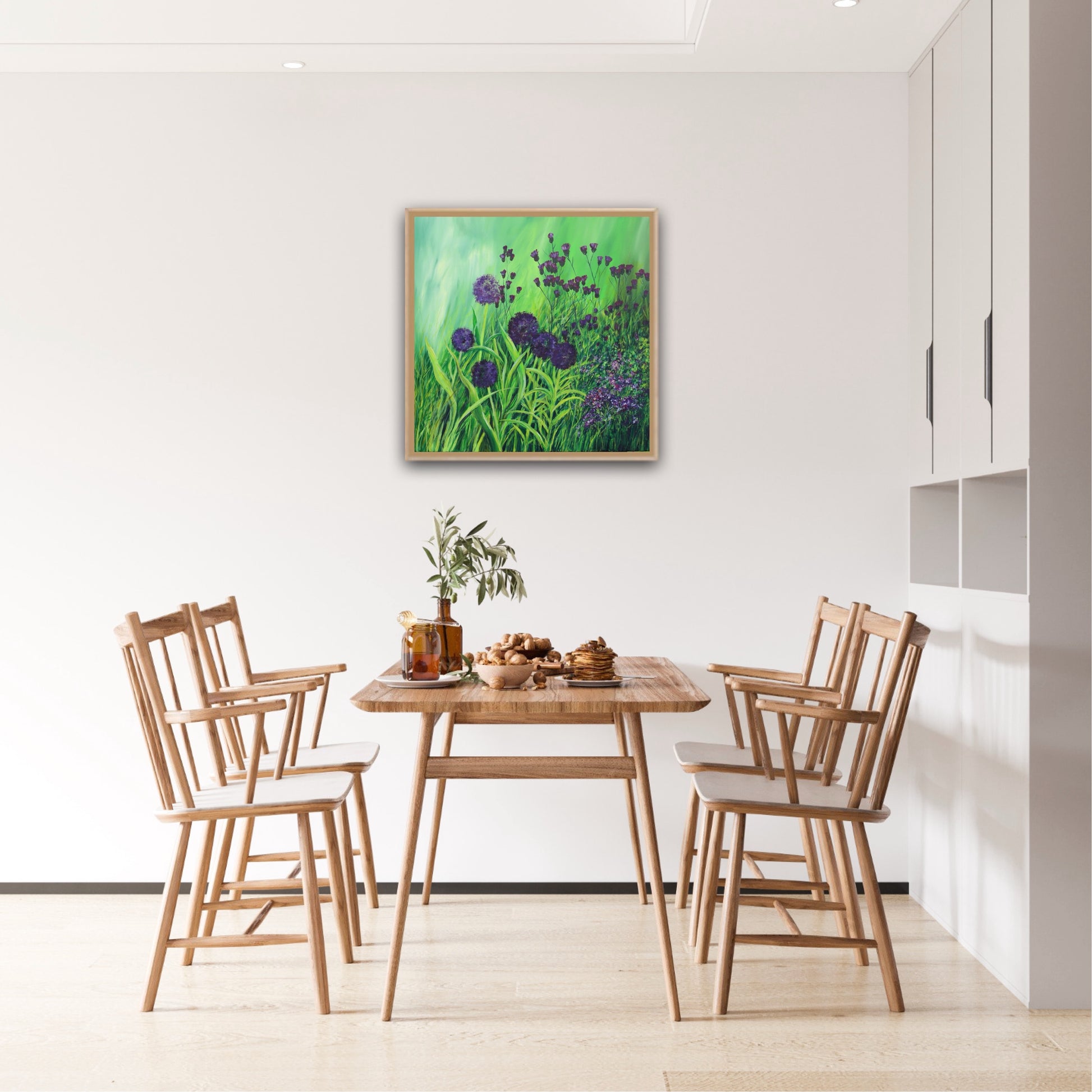 Rich Purple Alliums and flowers from my mother’s garden, set against a lush green lawn backdrop.