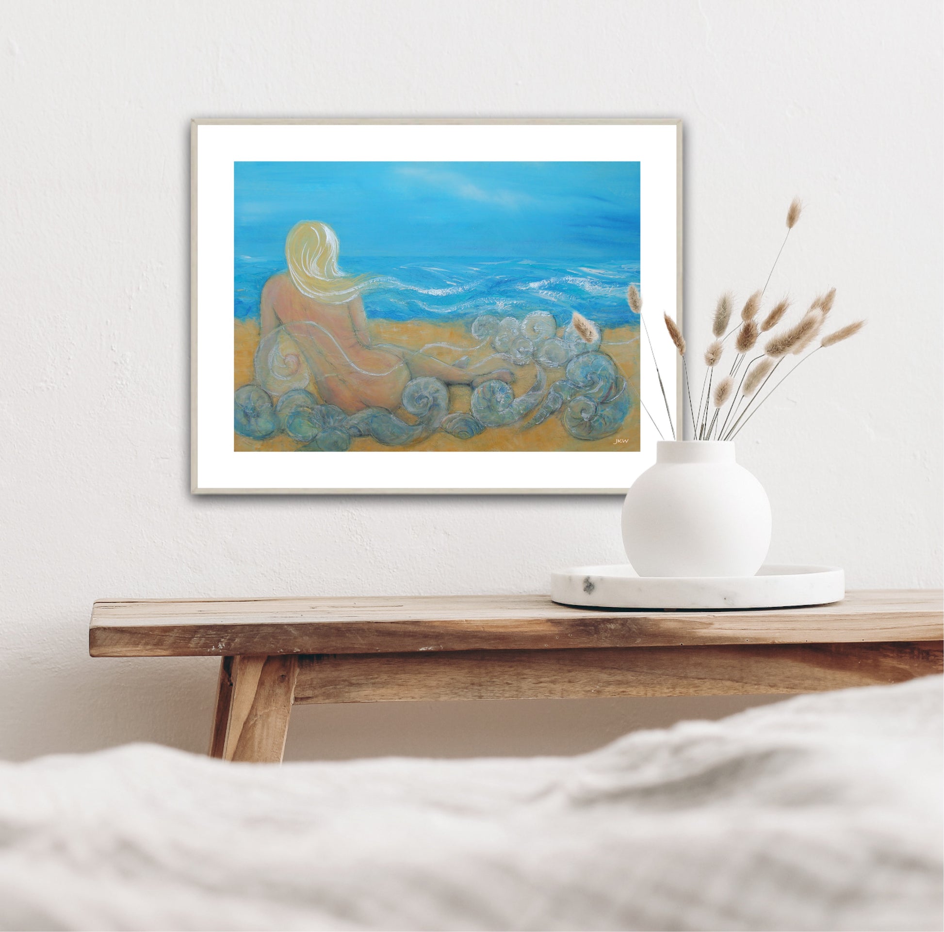 A reclining nude on the beach gazing out to sea, framed by swirling shells, soft blues, sandy golds, warm sun, and a gentle breeze.