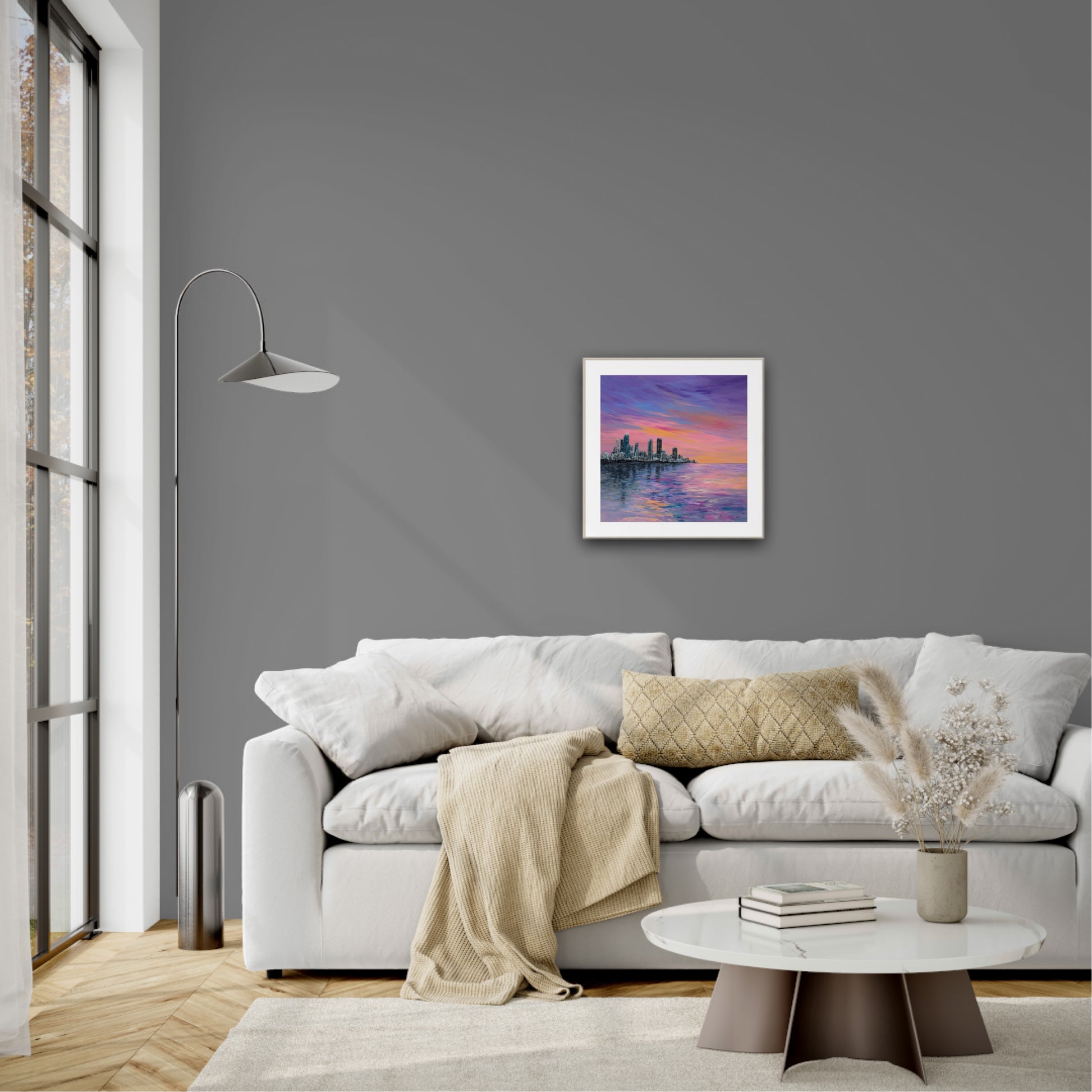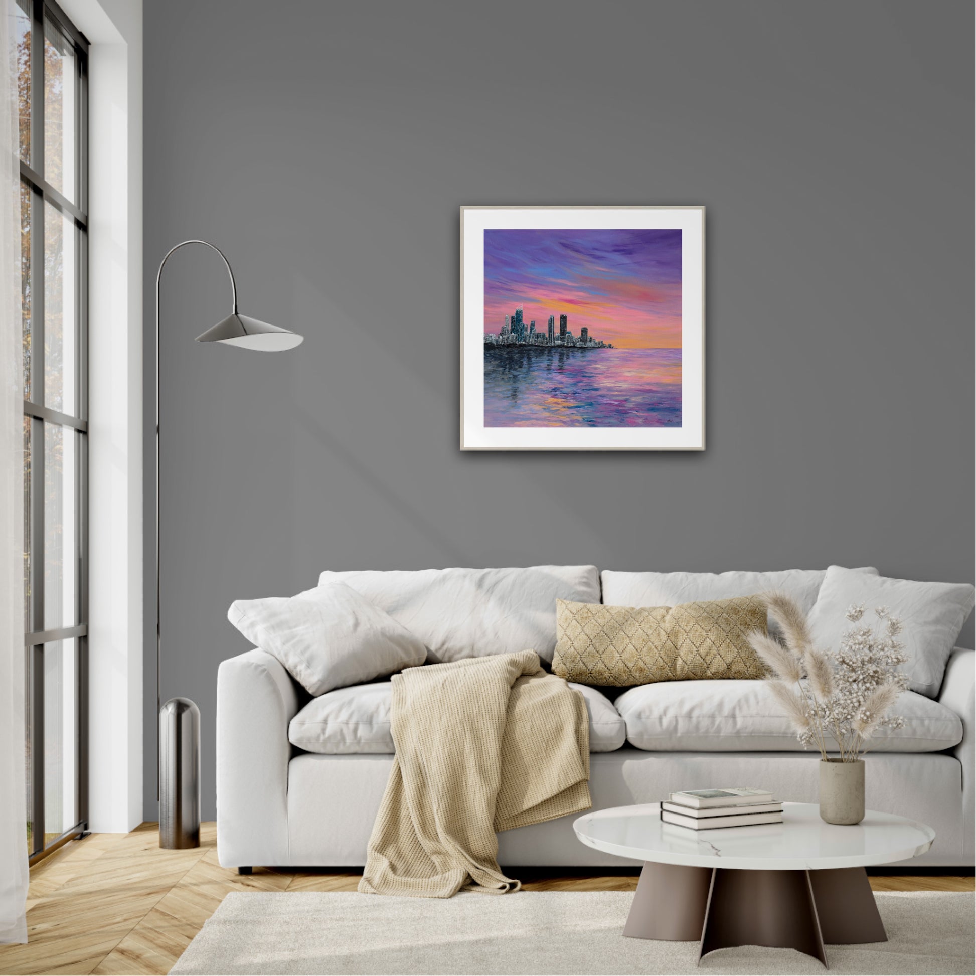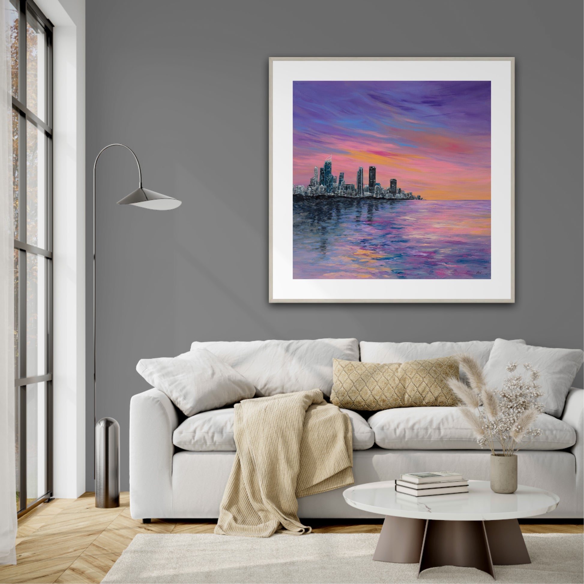 This print captures the stillness of the Surfers Paradise Skyline, standing in sharp contrast against a backlit sky alive with luminous pinks, purples, and golds.