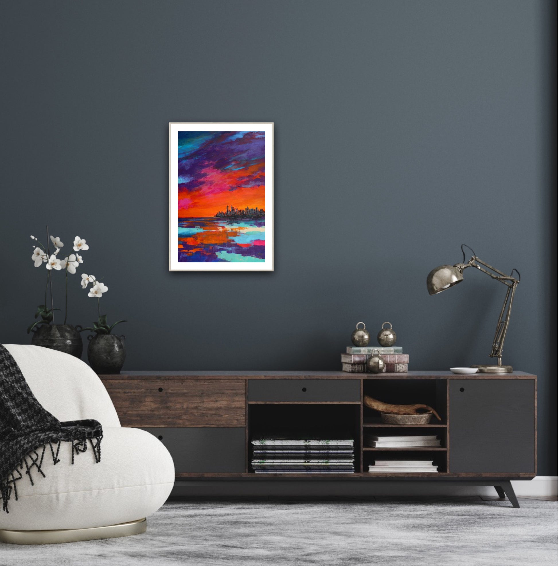 A contemporary print capturing a fleeting moment when the Surfers Paradise Skyline was silhouetted against a sky alive with twilight colours—vivid orange, pink, purple, and blue reflecting in the sea below.