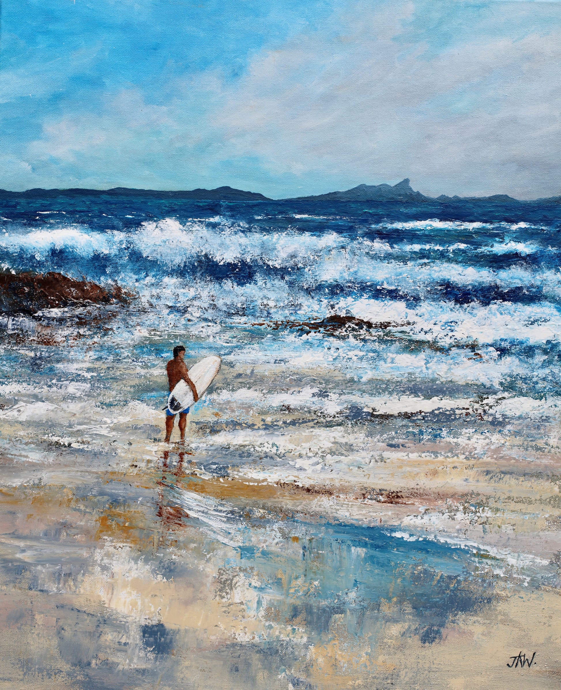 A lone surfer stands at the edge of the water on Wategos Beach, Byron Bay, contemplating the waves.