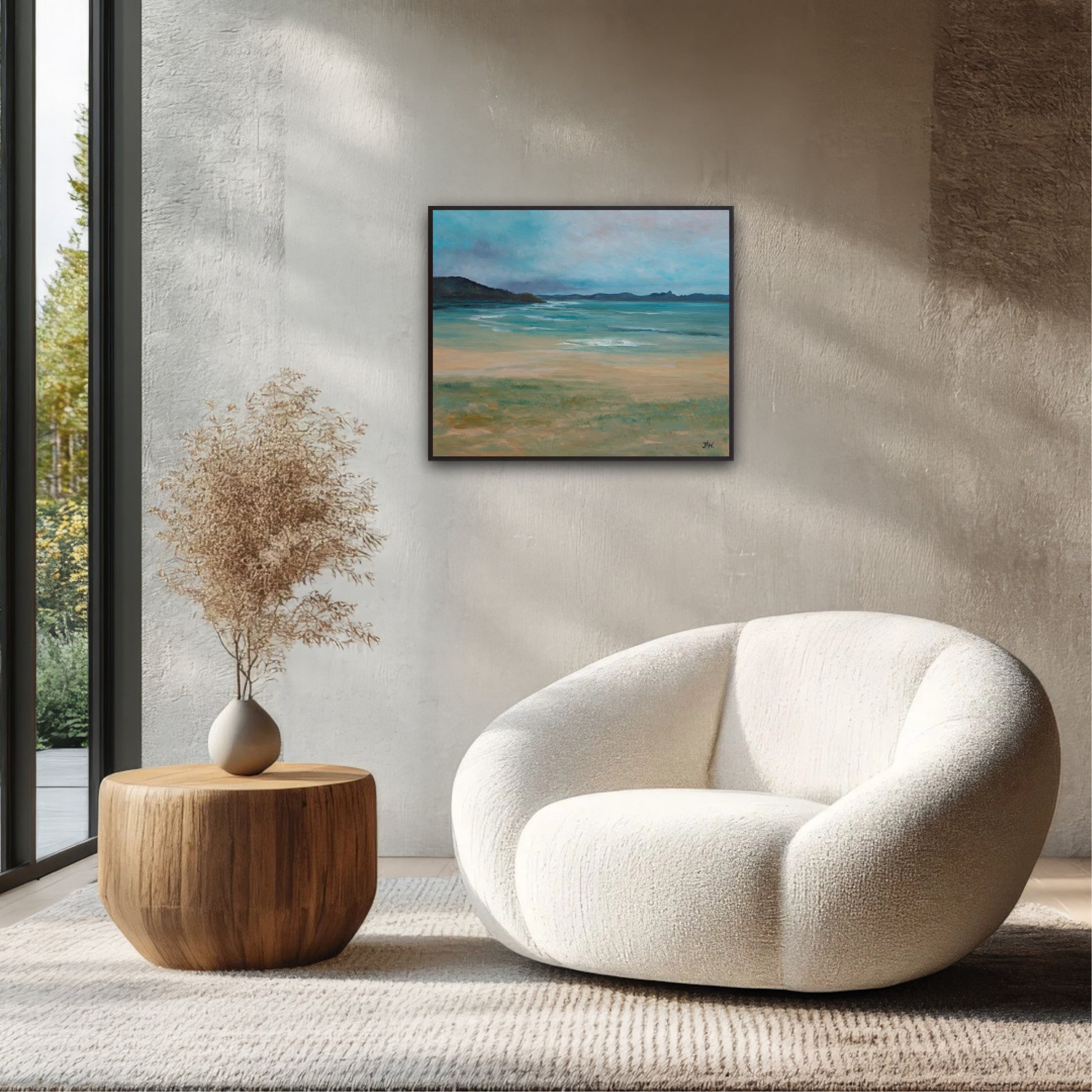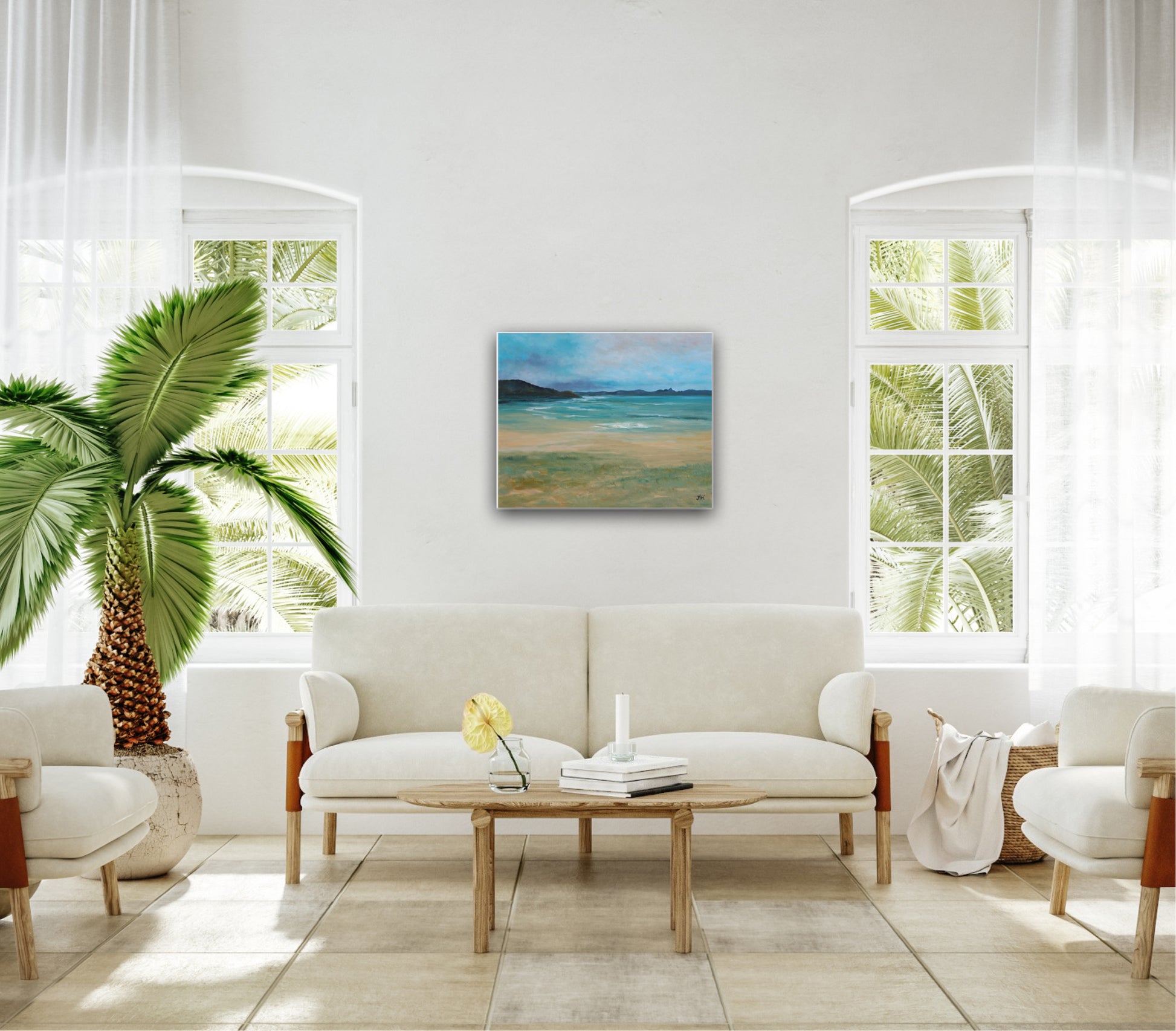 An atmospheric painting of Wategos Beach in Byron Bay with Mt. Wollumbin / Mt. Warning visible across the bay.