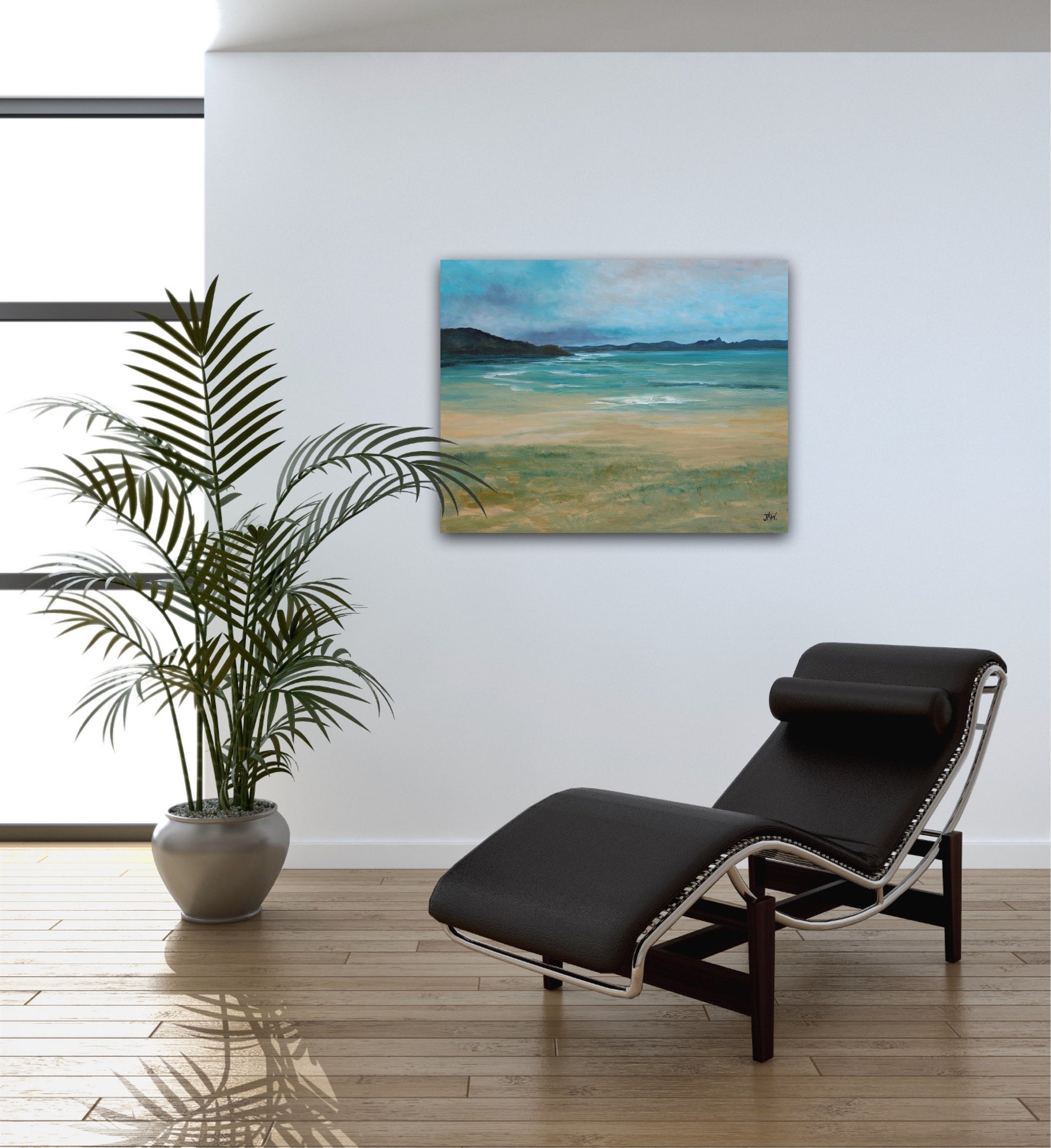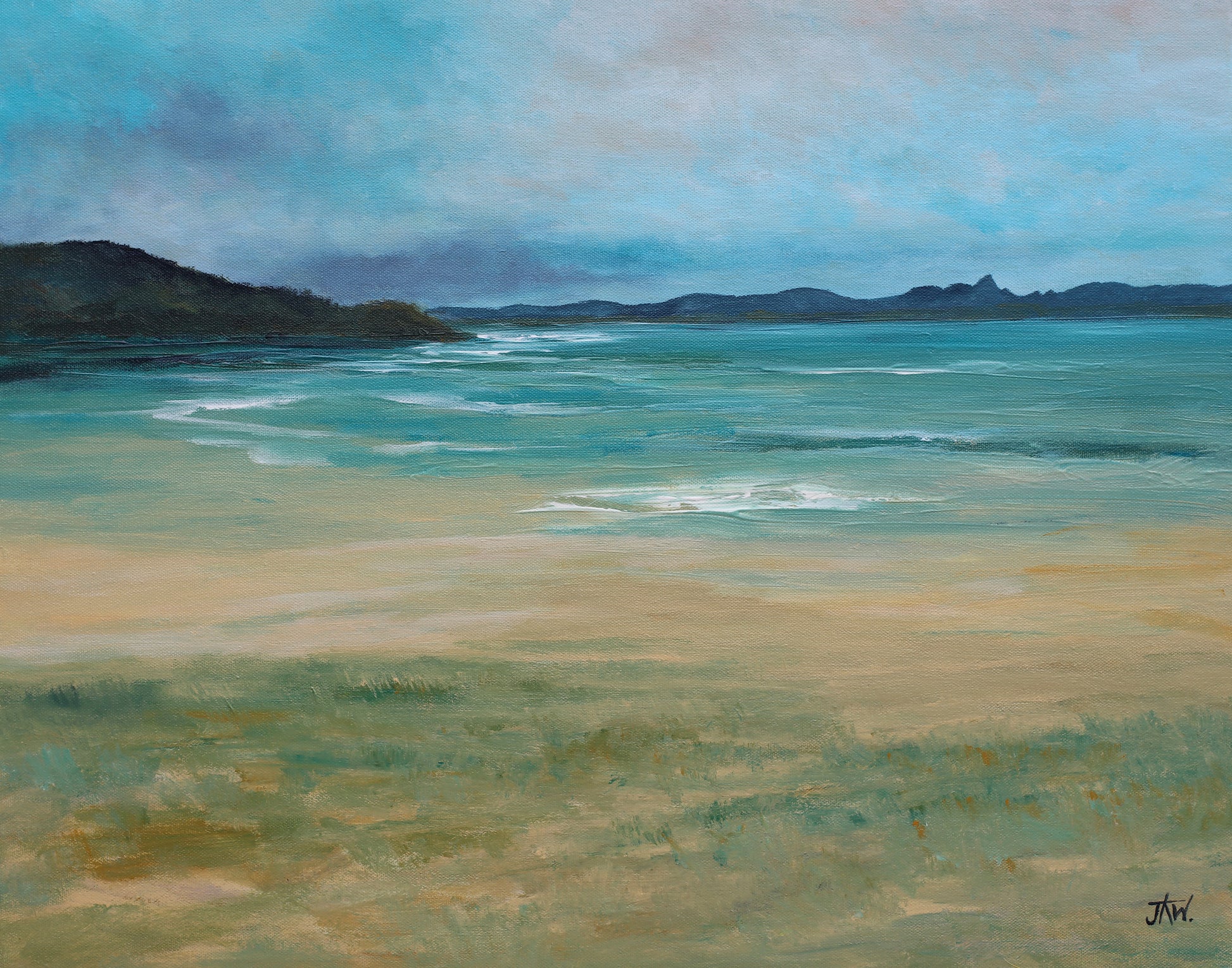 Tranquil atmospheric print, Wategos Beach in Byron Bay, NSW. Mt. Wollumbin / Mt. Warning visible across the bay.