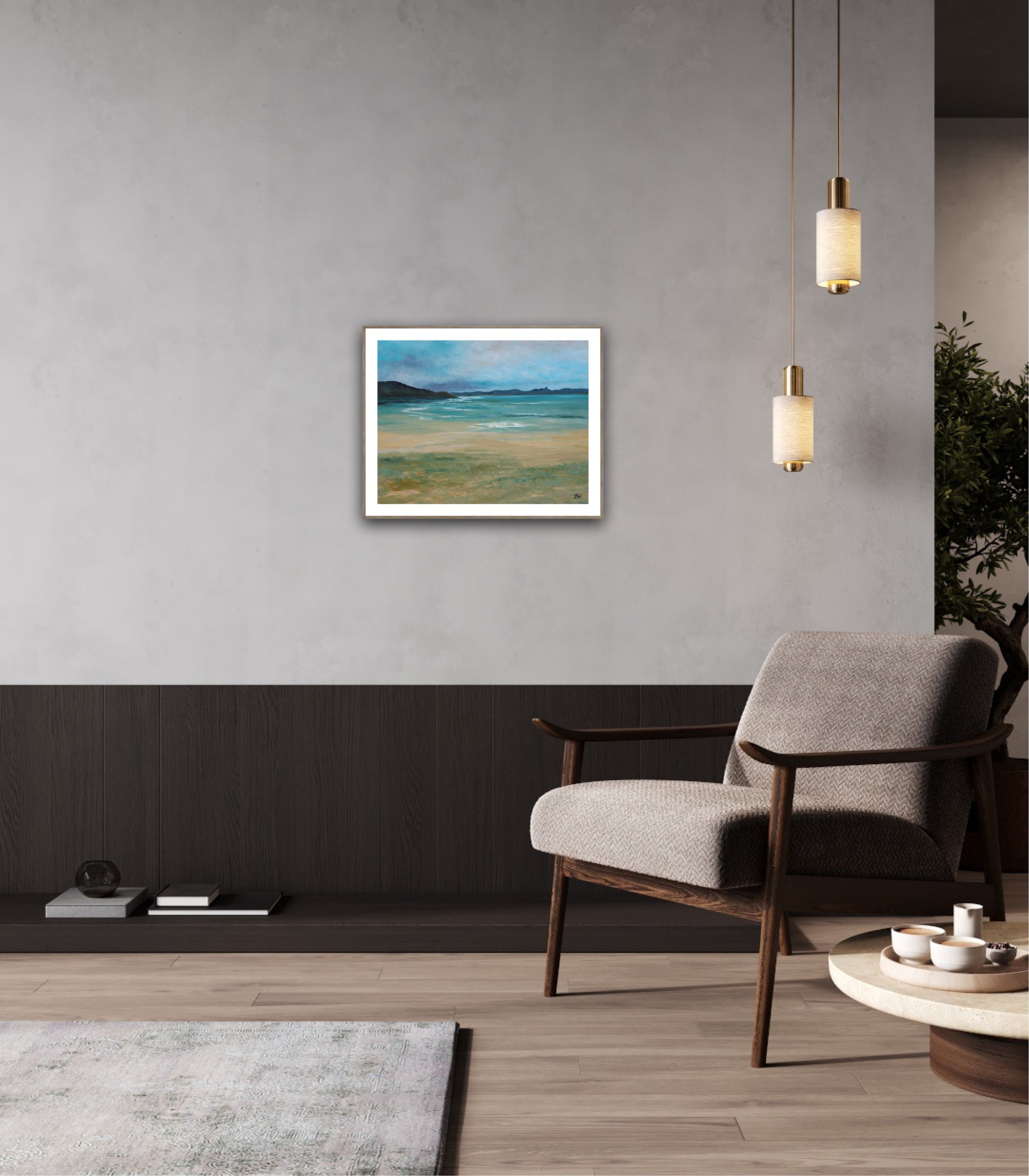 A tranquil atmospheric print of Wategos Beach in Byron Bay, NSW. Mt. Wollumbin / Mt. Warning is visible across the bay.