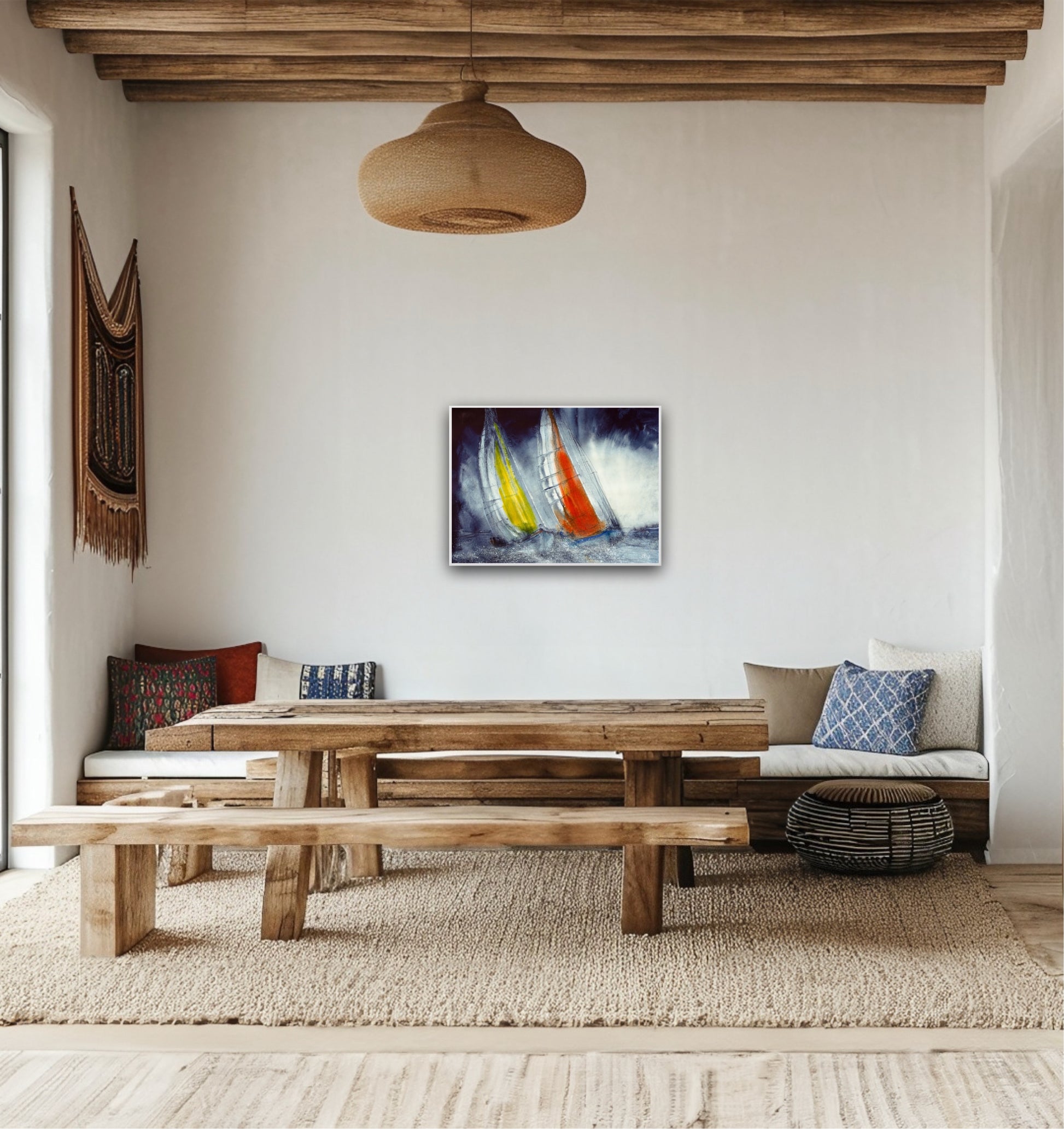 This print captures the excitement of wind and sea spray, conveying the thrill of the race as another yacht edges closer.