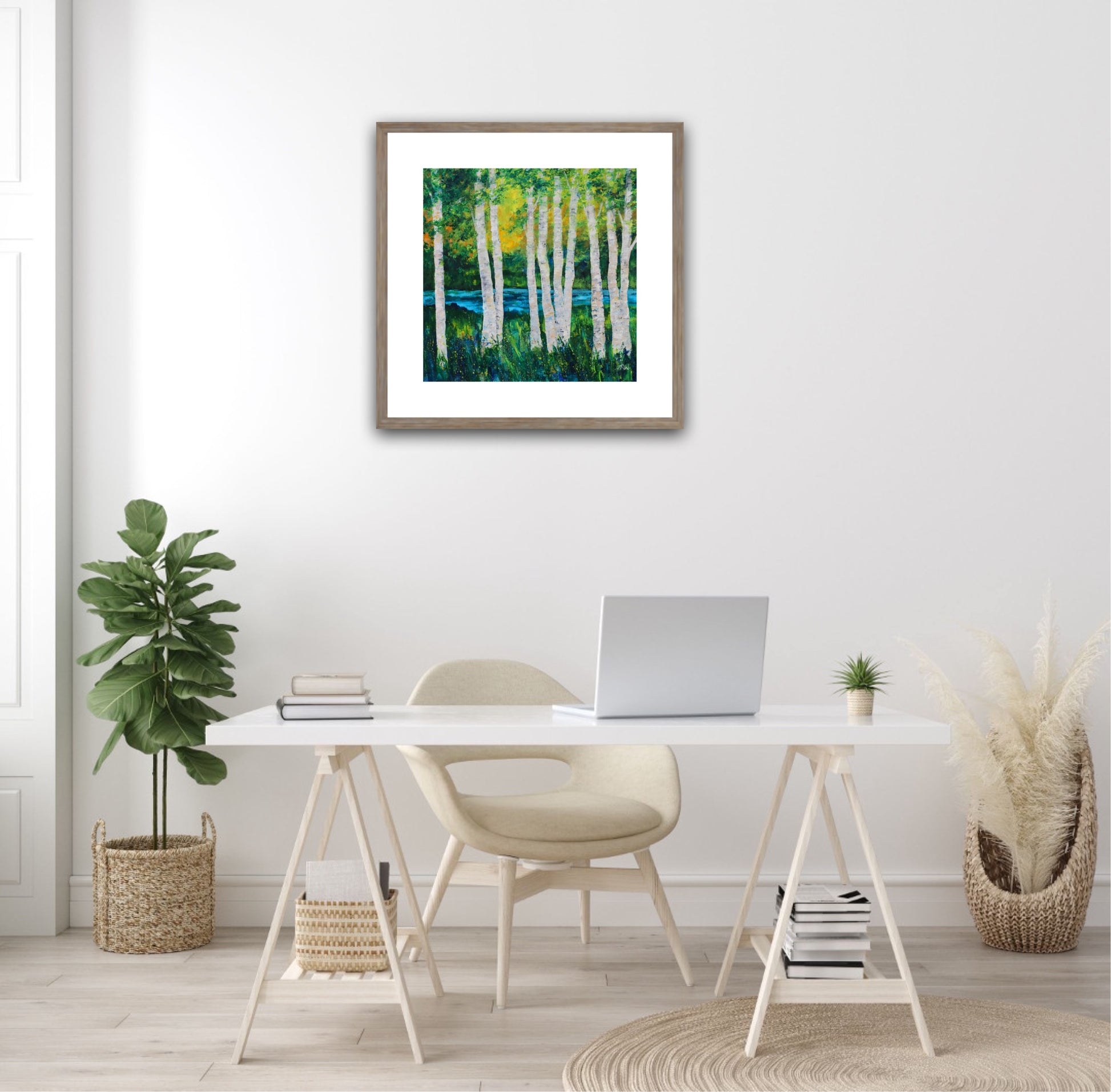 This was painted while I was on holiday in Italy. Tall silver birch trees catching the late afternoon sunlight.