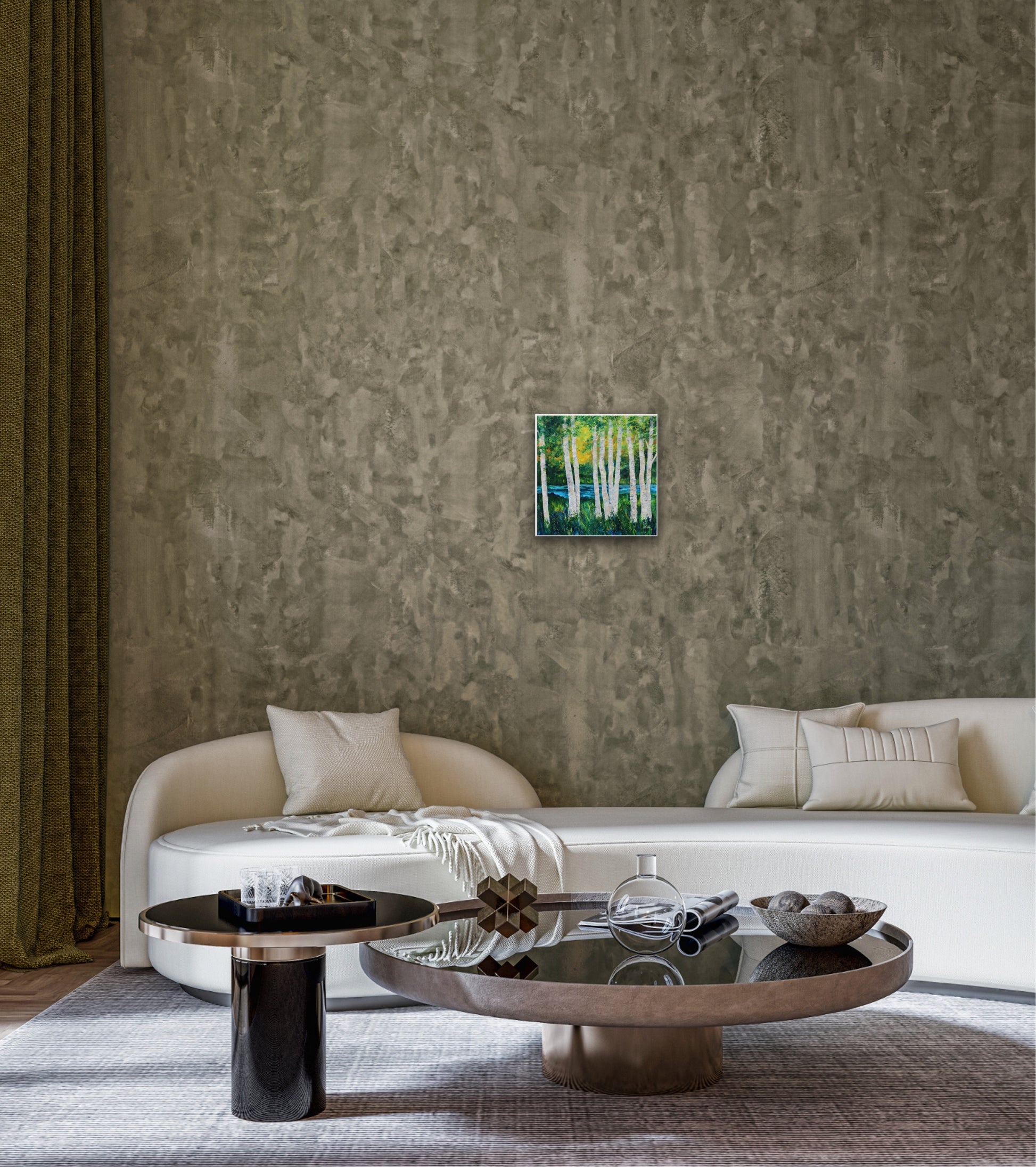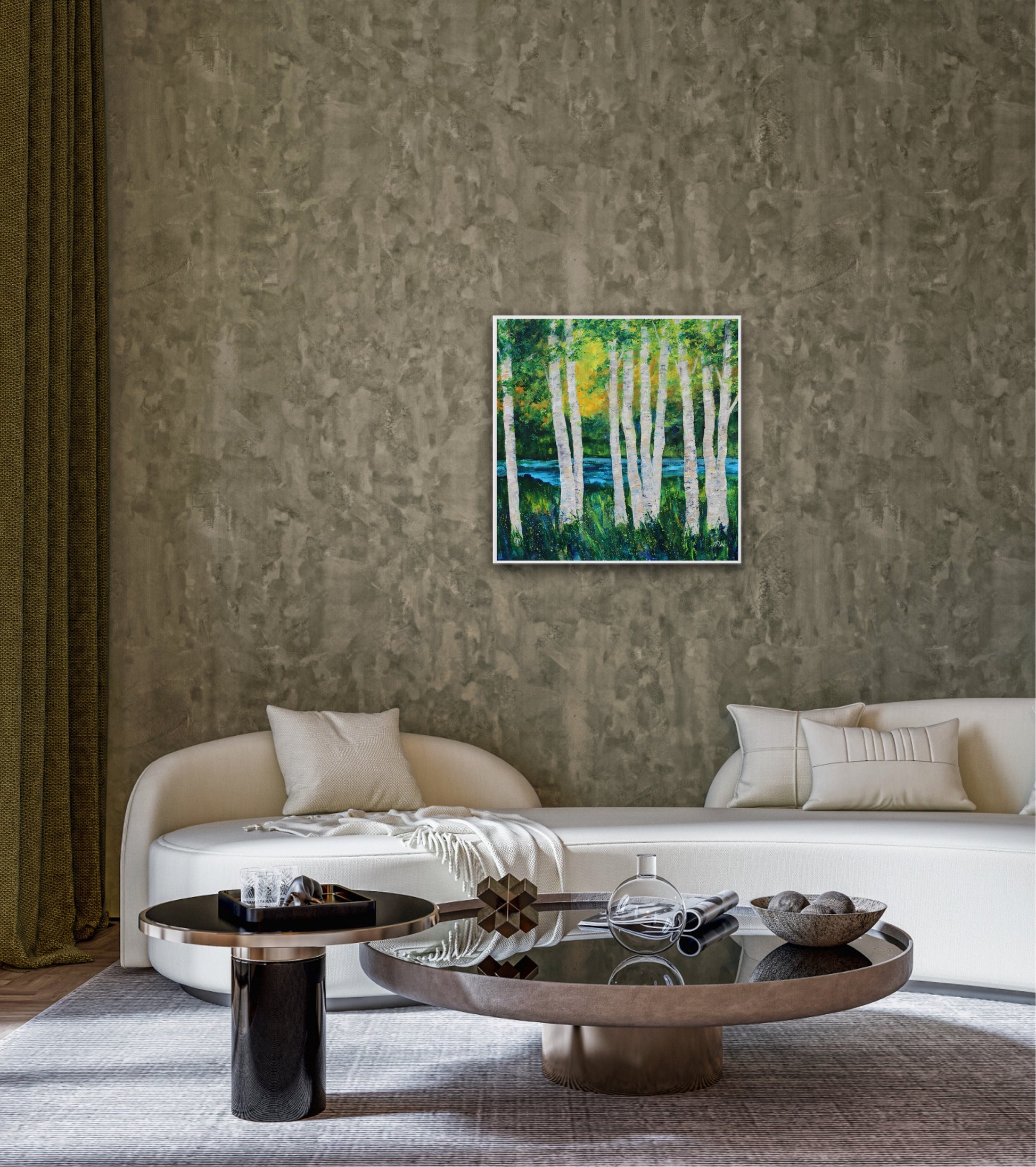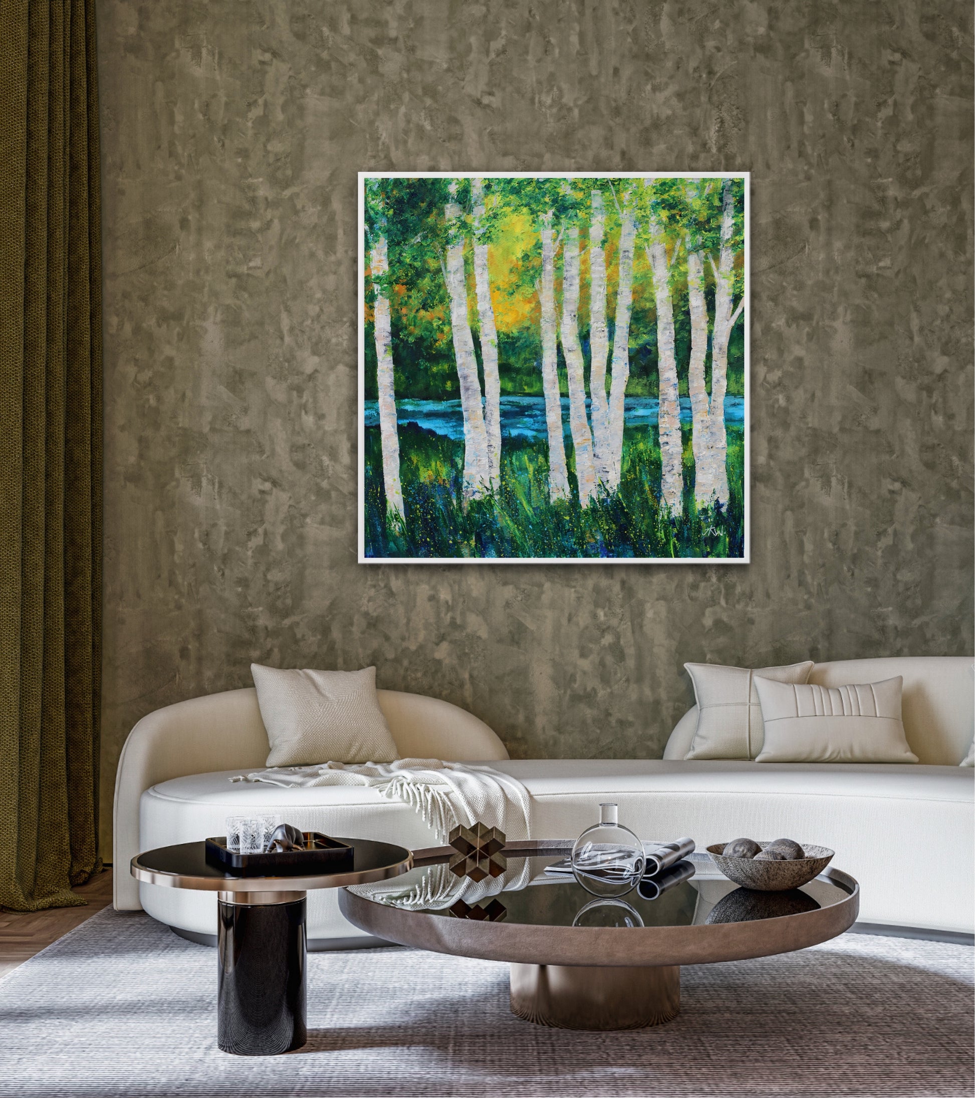 This is a print of a painting I painted while I was on holiday in Italy. Tall silver birch trees catching the late afternoon sunlight