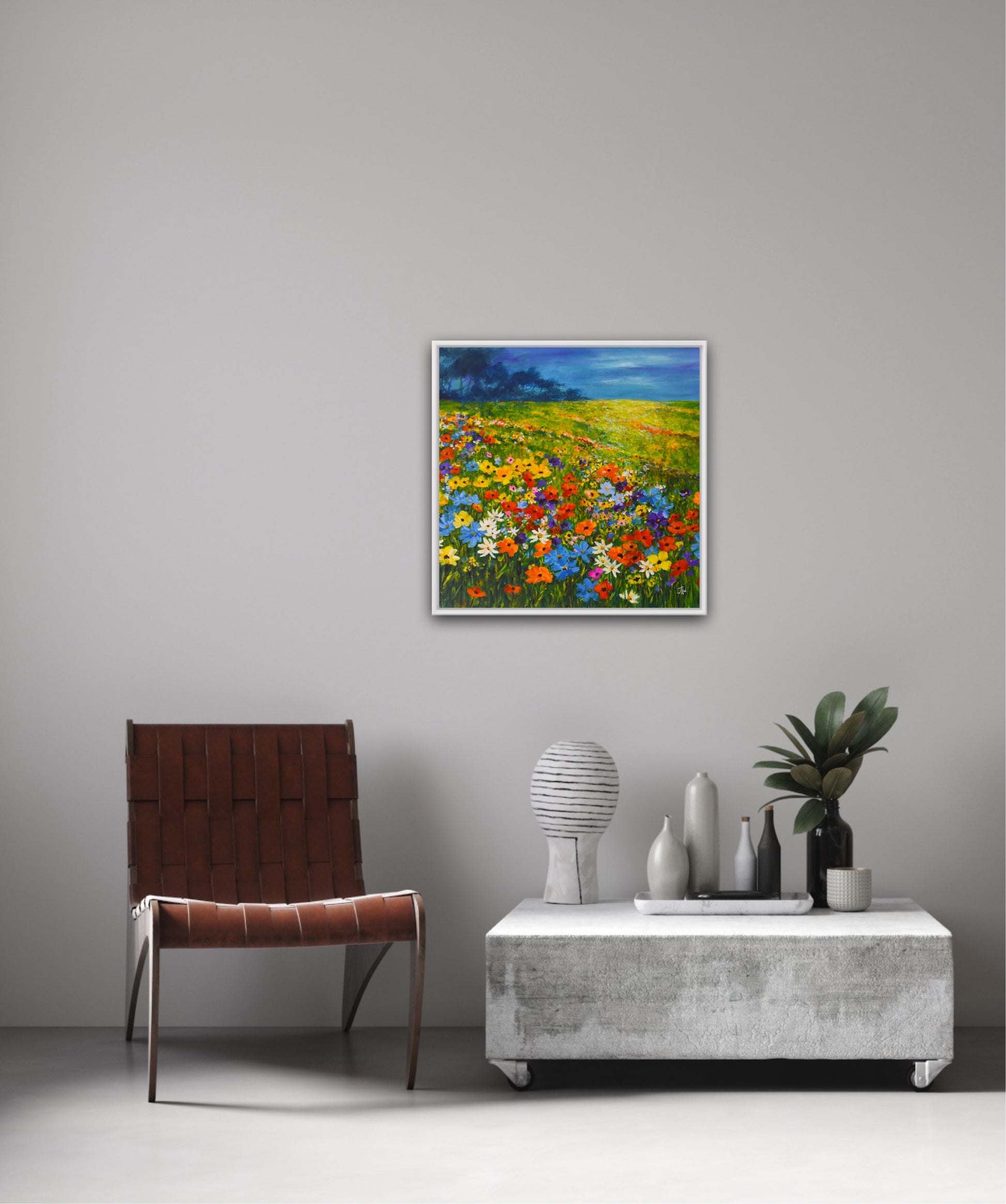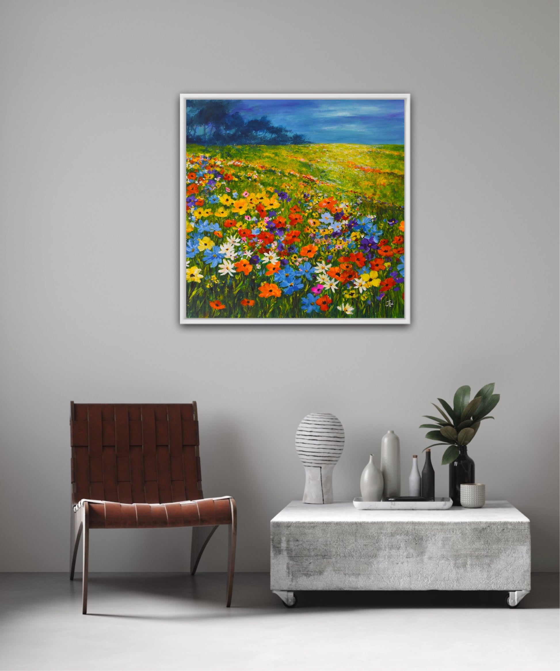 A vibrant print of colourful flowers on the hillside near where I lived in Wales.