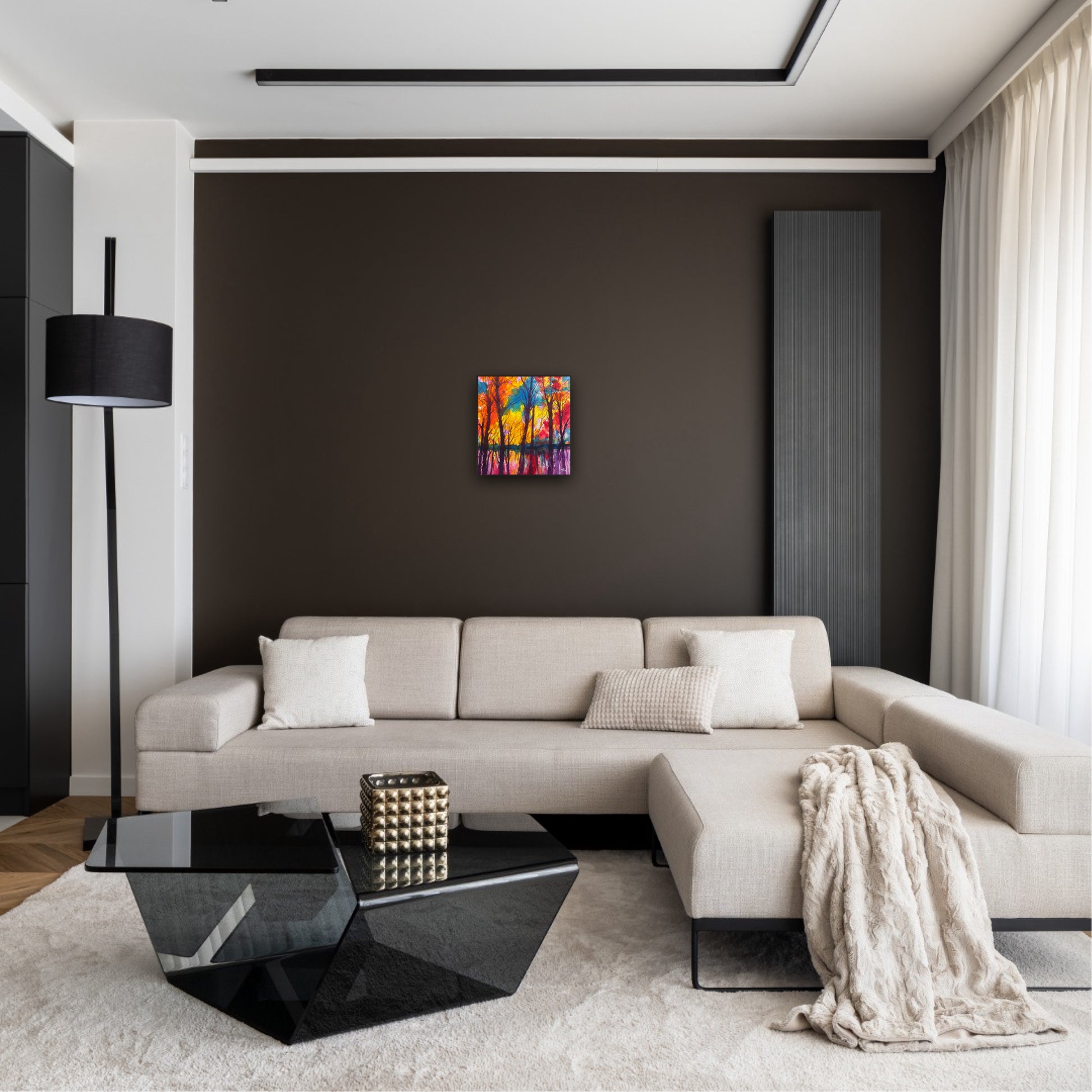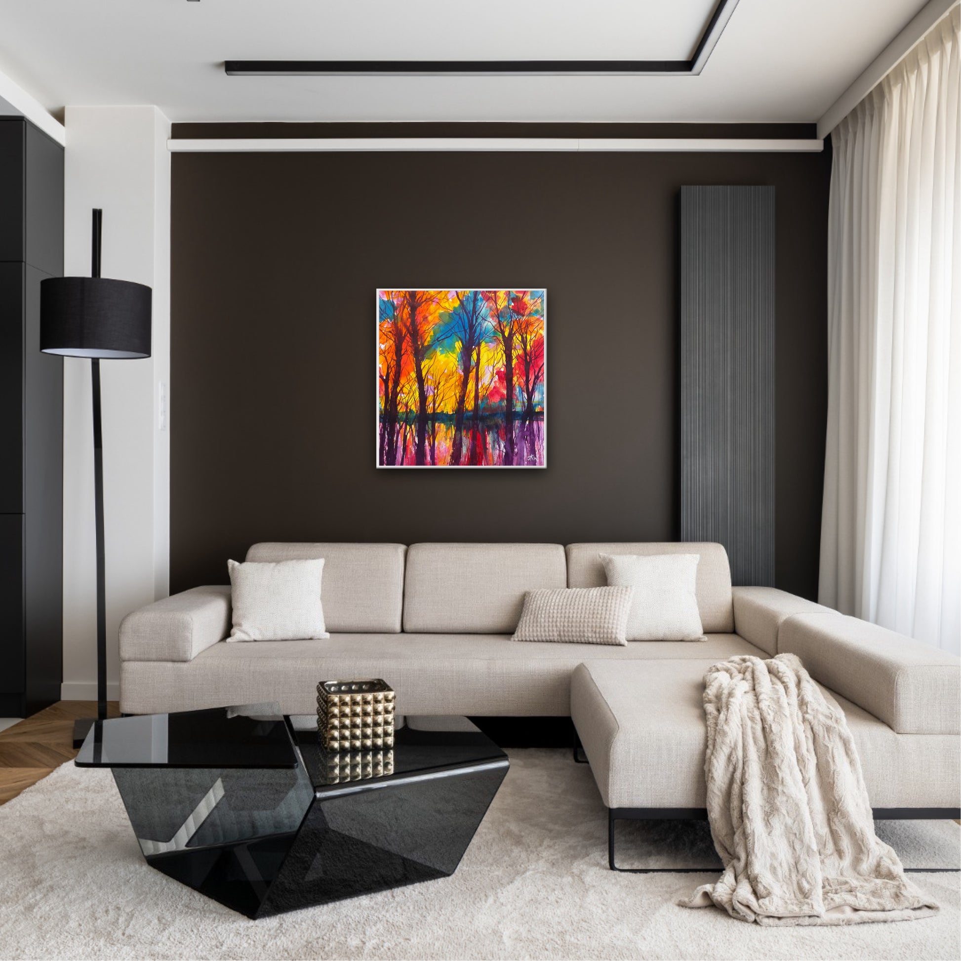 A contemporary painting of autumn woodland trees and colours reflected onto the river water below.