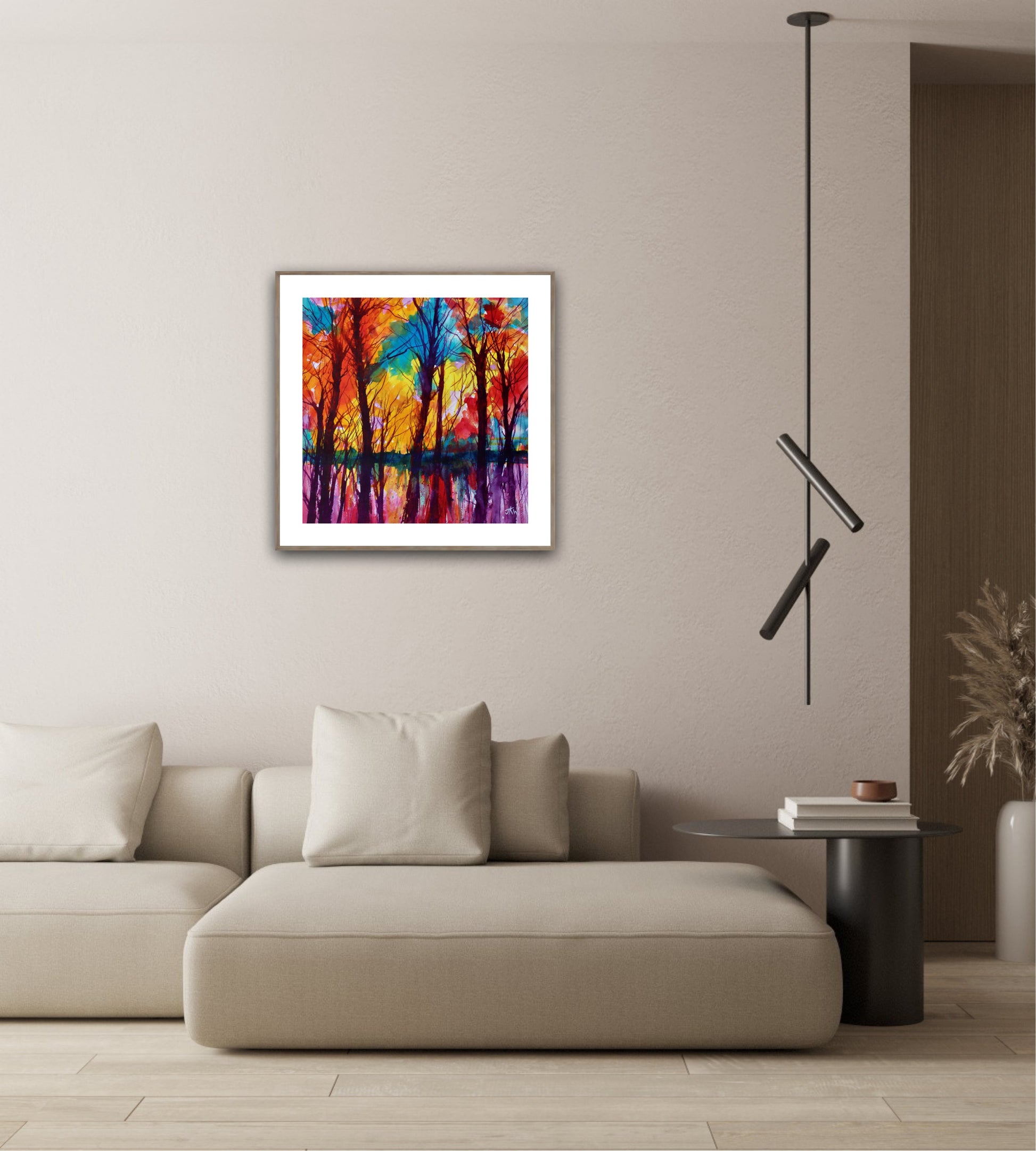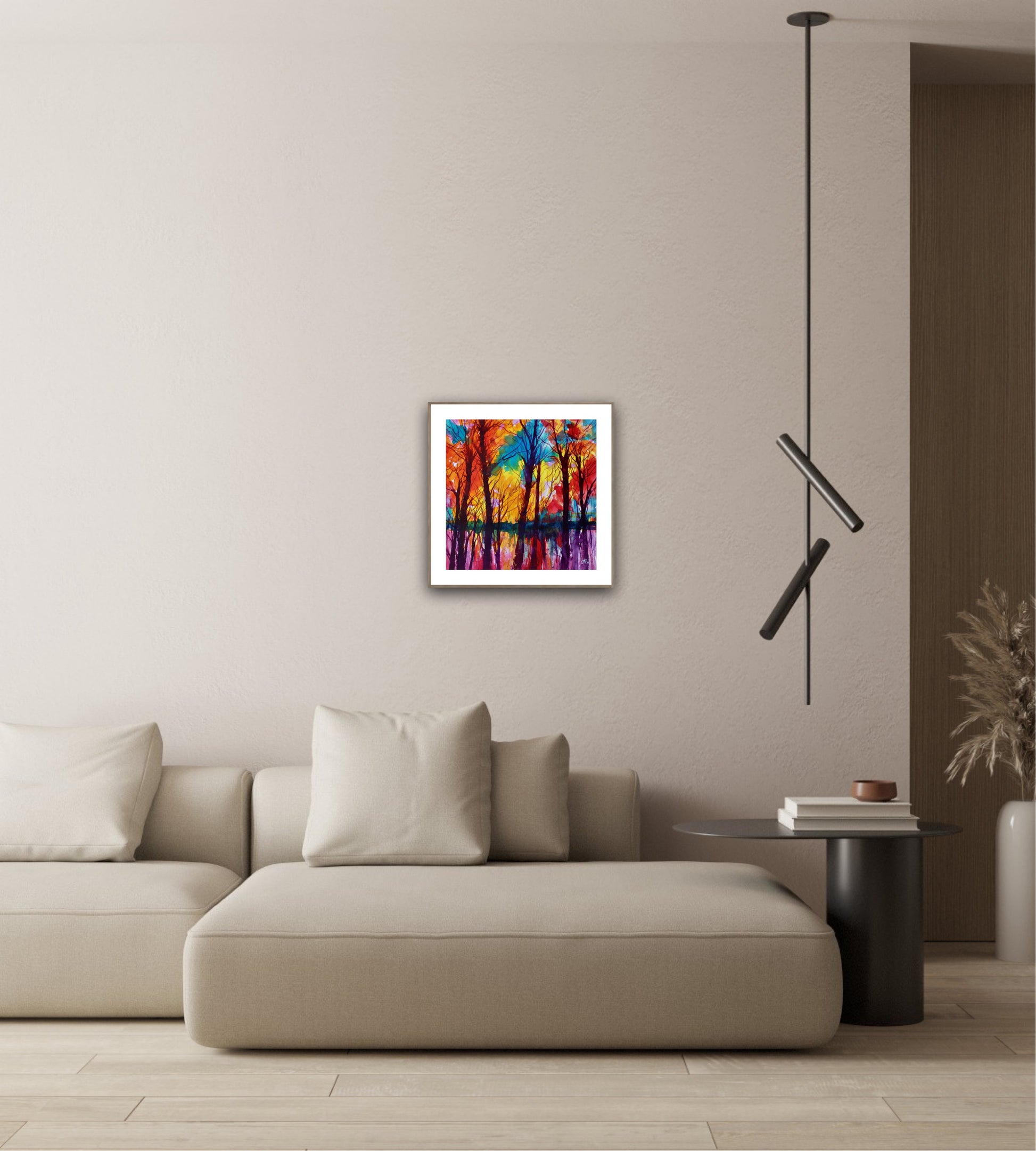 A contemporary painting of autumn woodland trees and colours reflected on the still river waters below.
